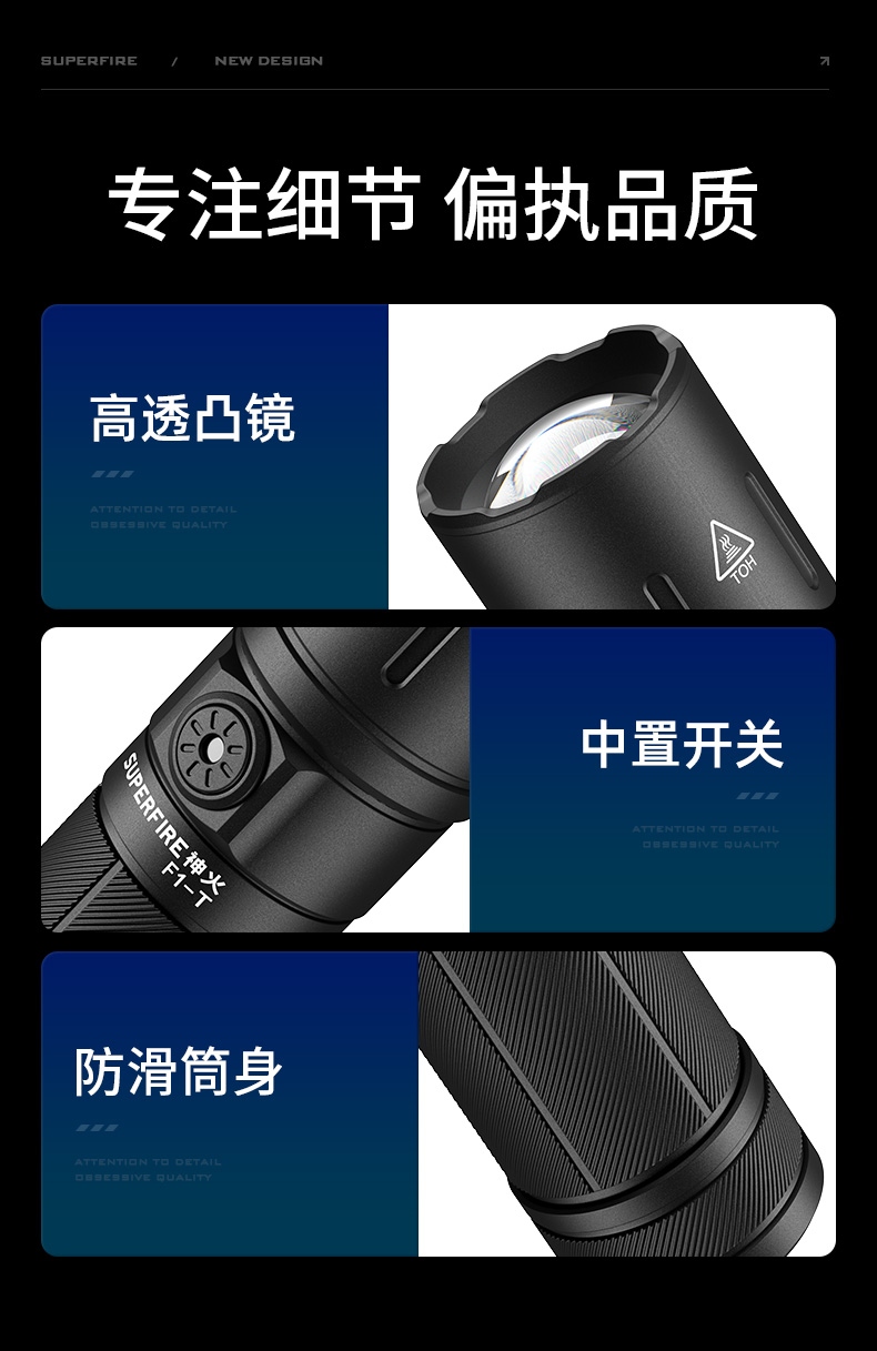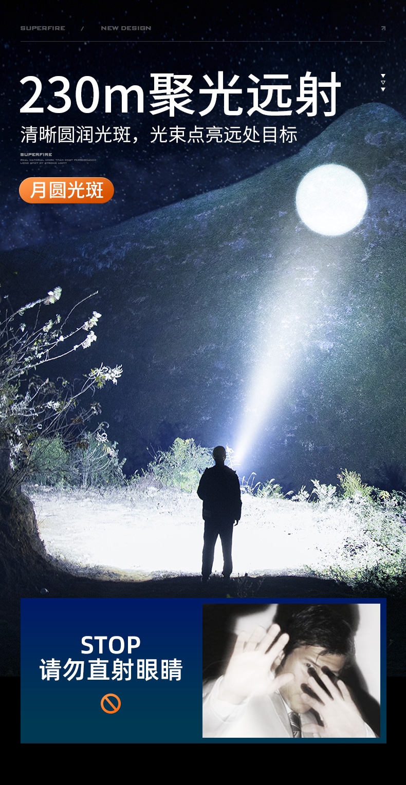 1、千米远射,射程更远,光斑更聚焦。 2、进口灯珠,亮度高,照明效果更好。 3、前后双按键,光源一键点亮,高亮瞬间开启。