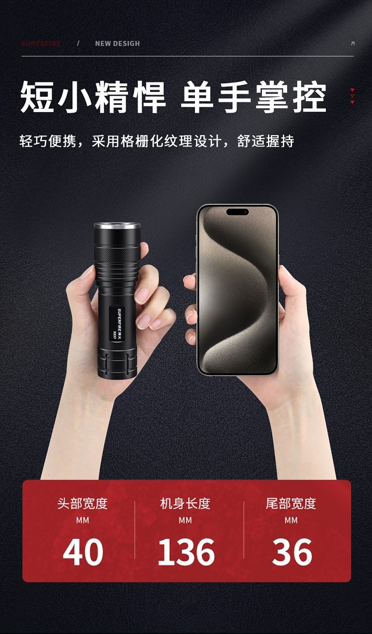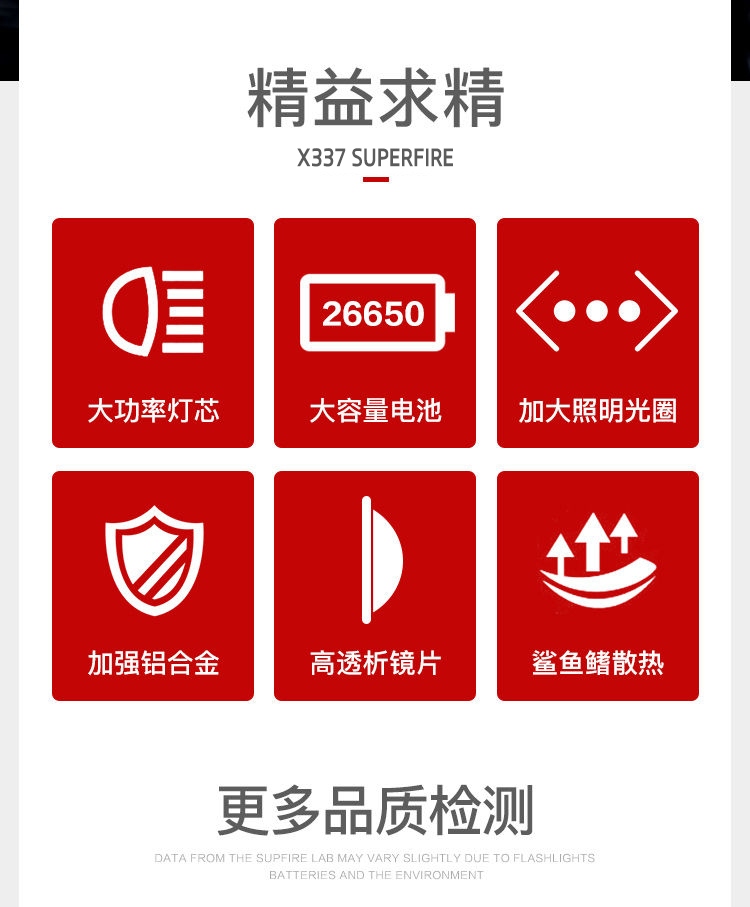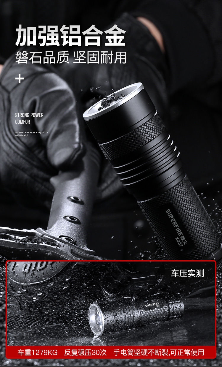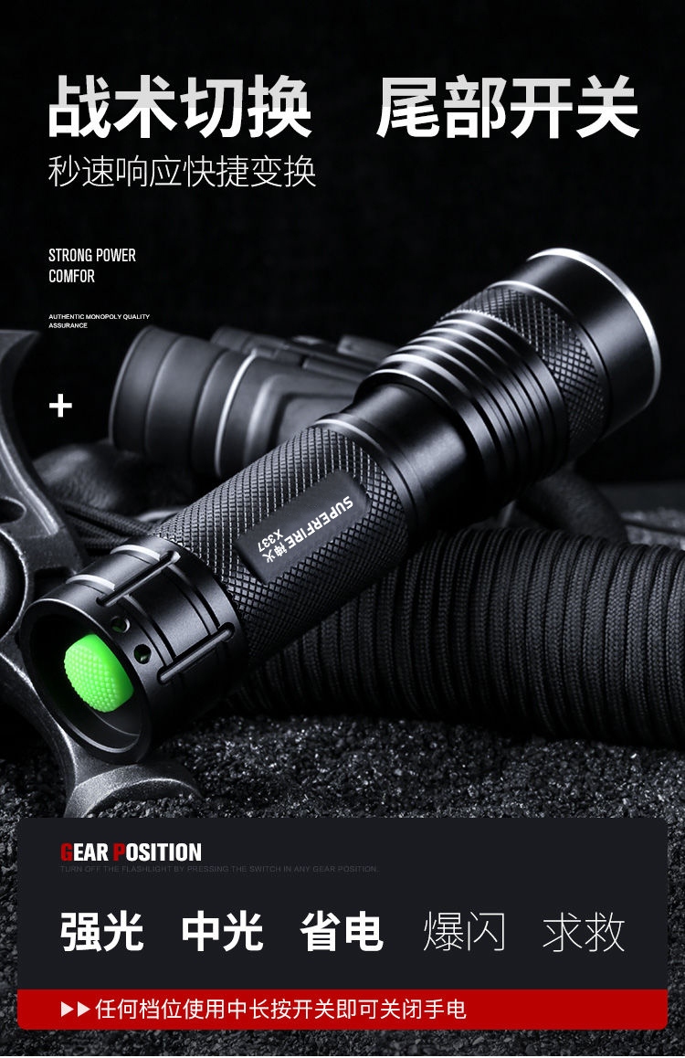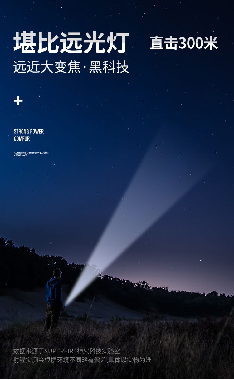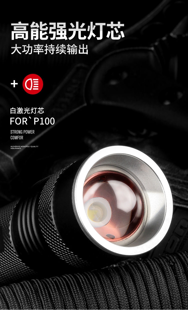 1、千米远射,射程更远,光斑更聚焦。 2、进口灯珠,亮度高,照明效果更好。 3、前后双按键,光源一键点亮,高亮瞬间开启。