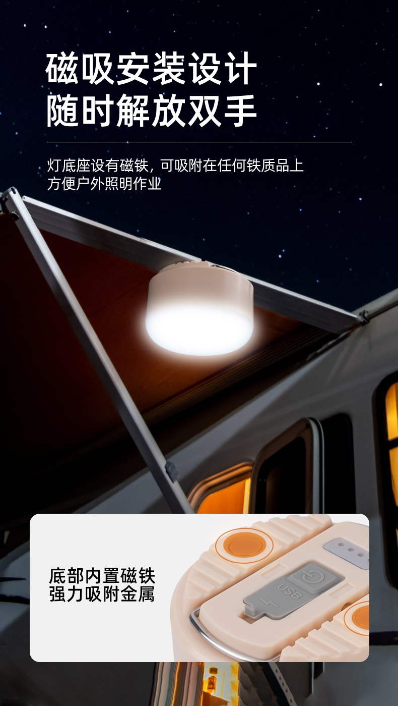 六大优势 点亮暗夜 三档调光 持久续航 磁吸安装 电量显示 悬挂照明