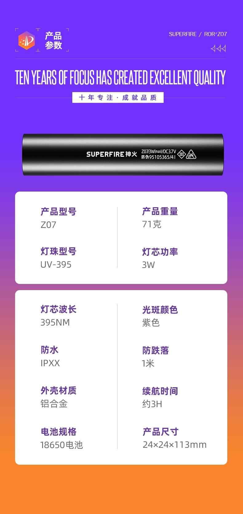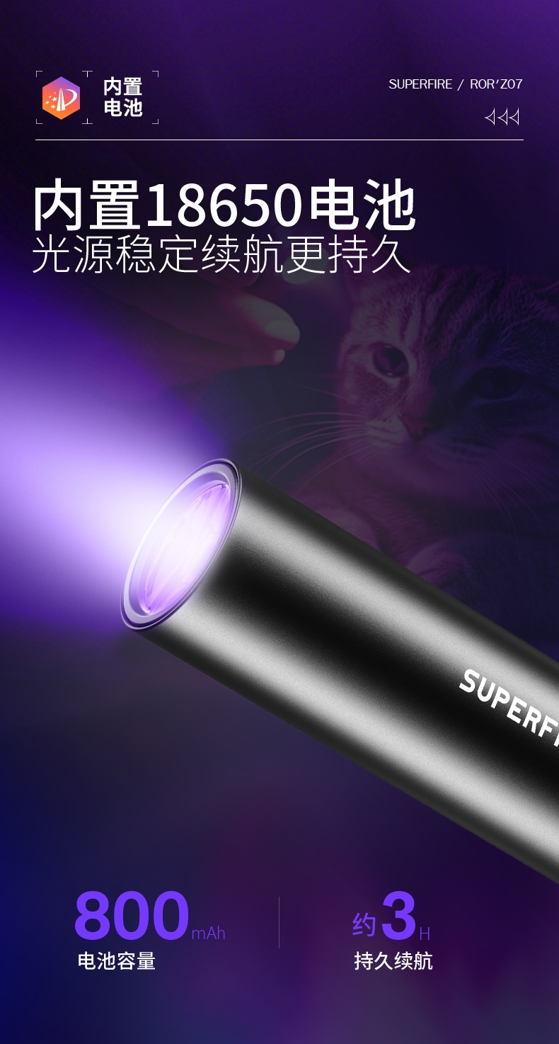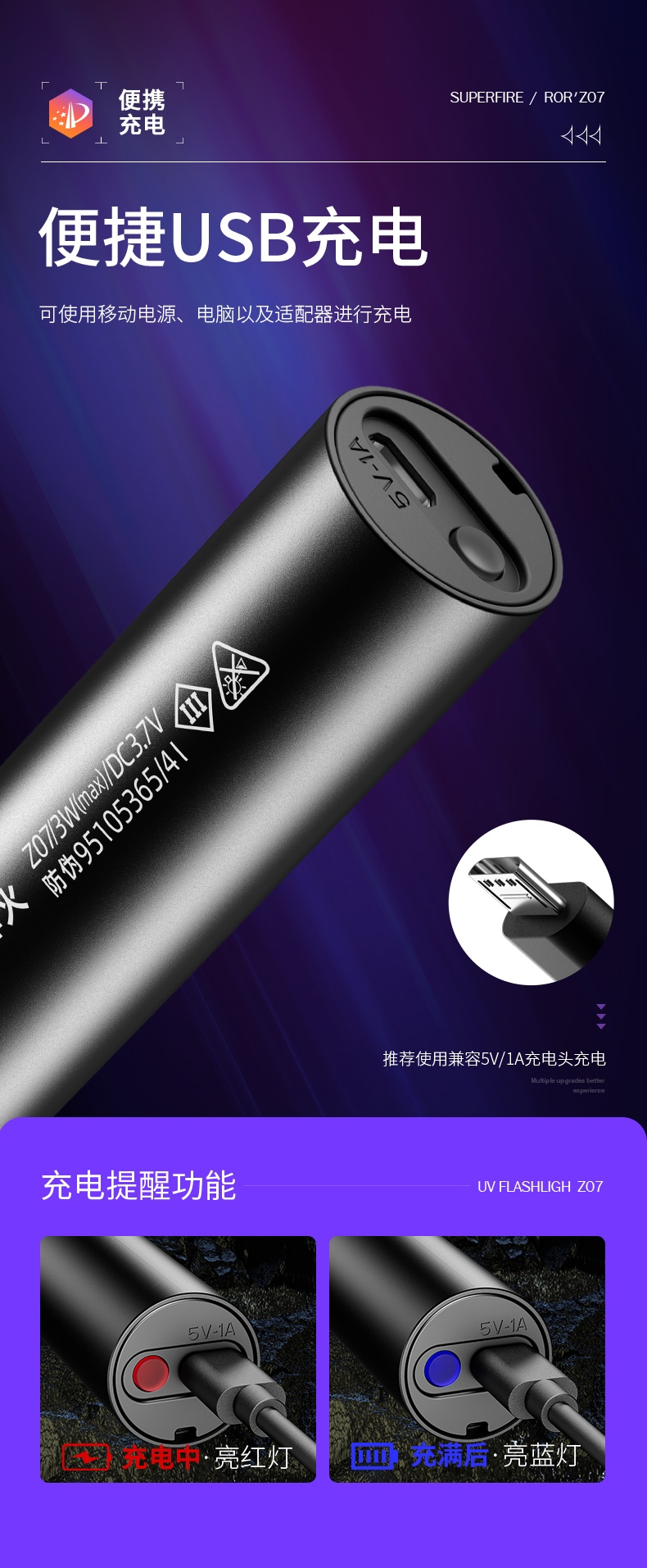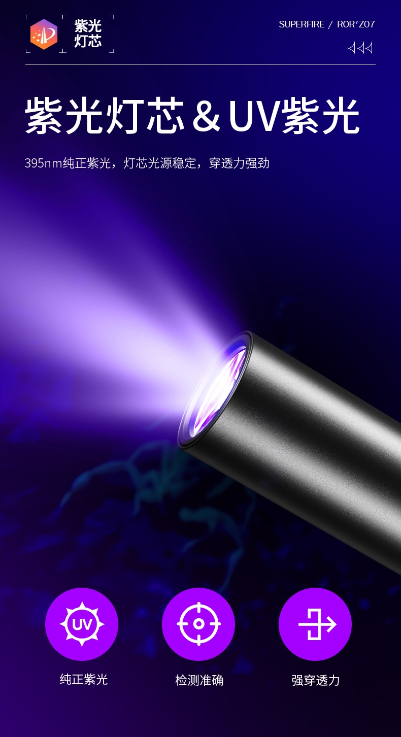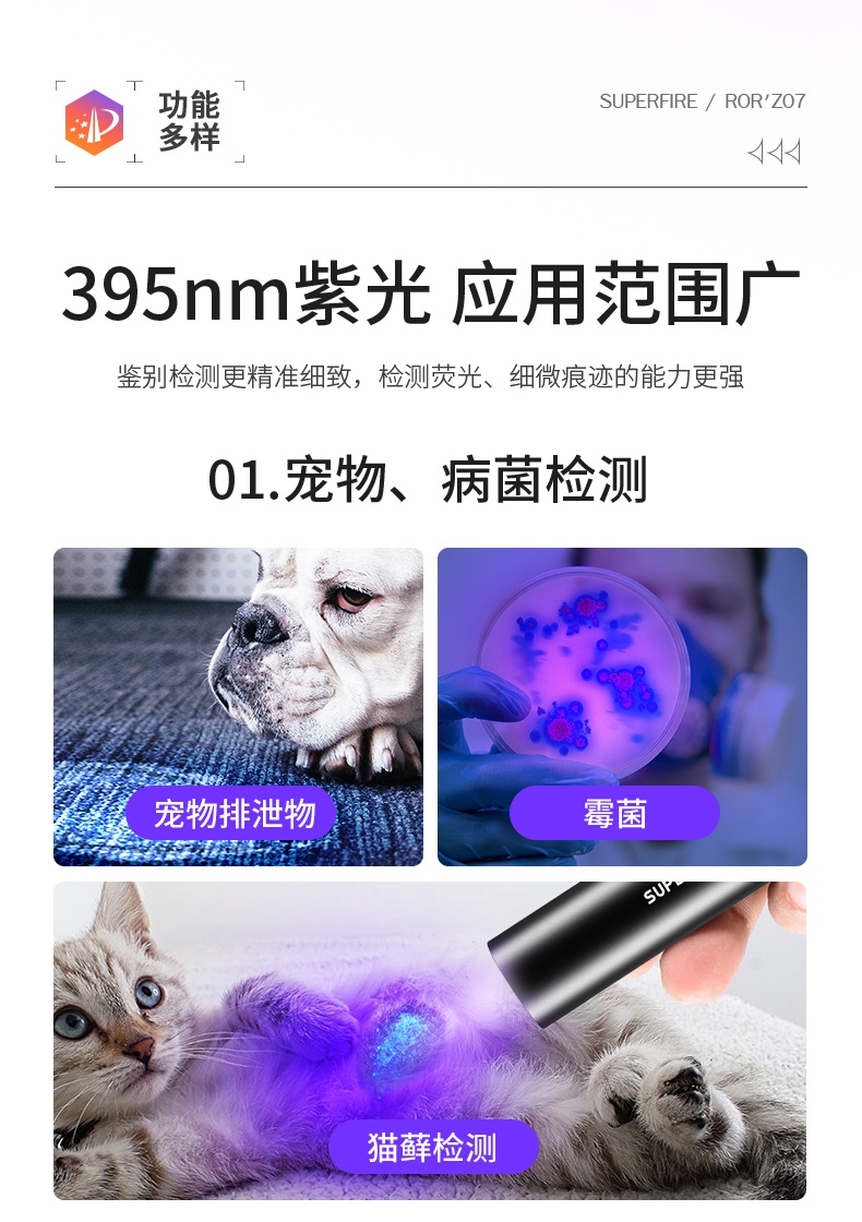 1、紫光手电:可用于验钞、识别荧光剂,宠物荧光检测,鉴别琥珀、蜜蜡,古玩修补鉴定。 2、单档开关,操作便捷。