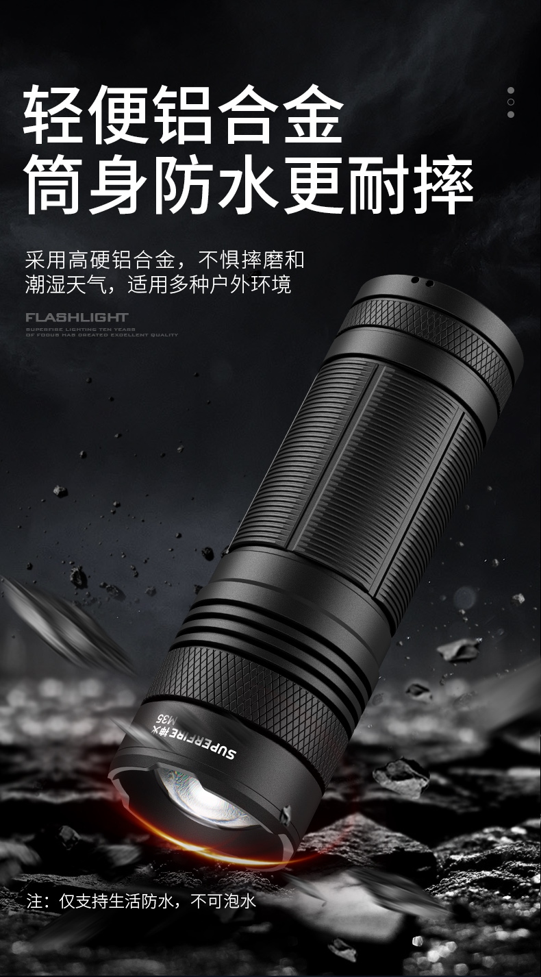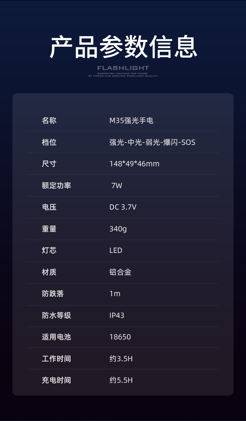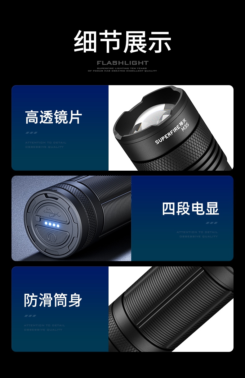 1、多档调光,可满足不同场景下的使用需求。 2、推拉灯头可实现伸缩调焦。 3、光斑大,照明效果好。