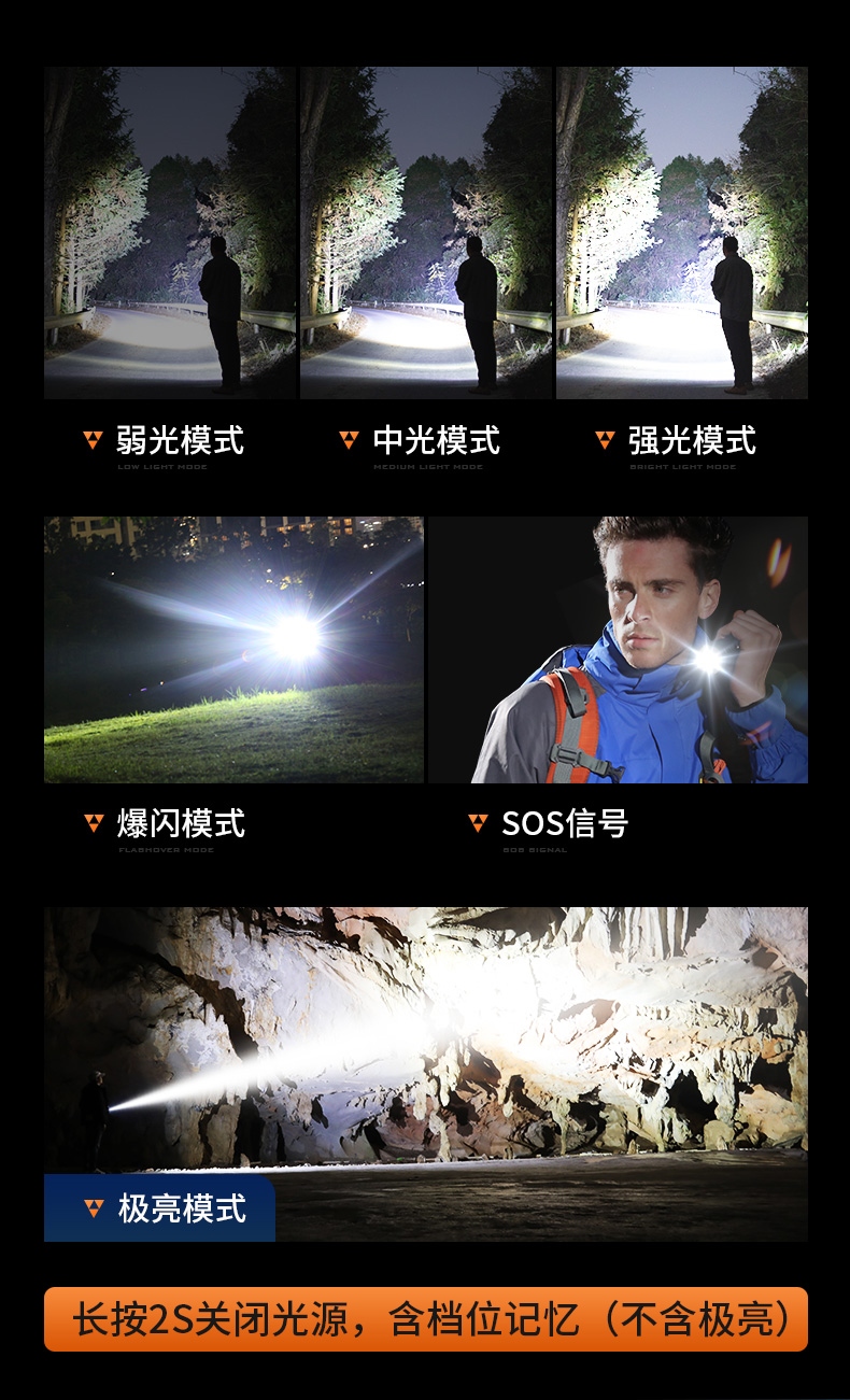 聚光主灯 亮度随心 轻按后端开关按钮,主灯强光点亮,续按依次切换主灯工作光-爆闪光。主灯开启状态下长按5秒,可实现光源色温转换。主灯关闭状态下长按5秒,可开启灯具最亮照明模式。 爆亮强光 亮如白昼 1500LM大功率高亮光源,点亮顷刻如白昼
