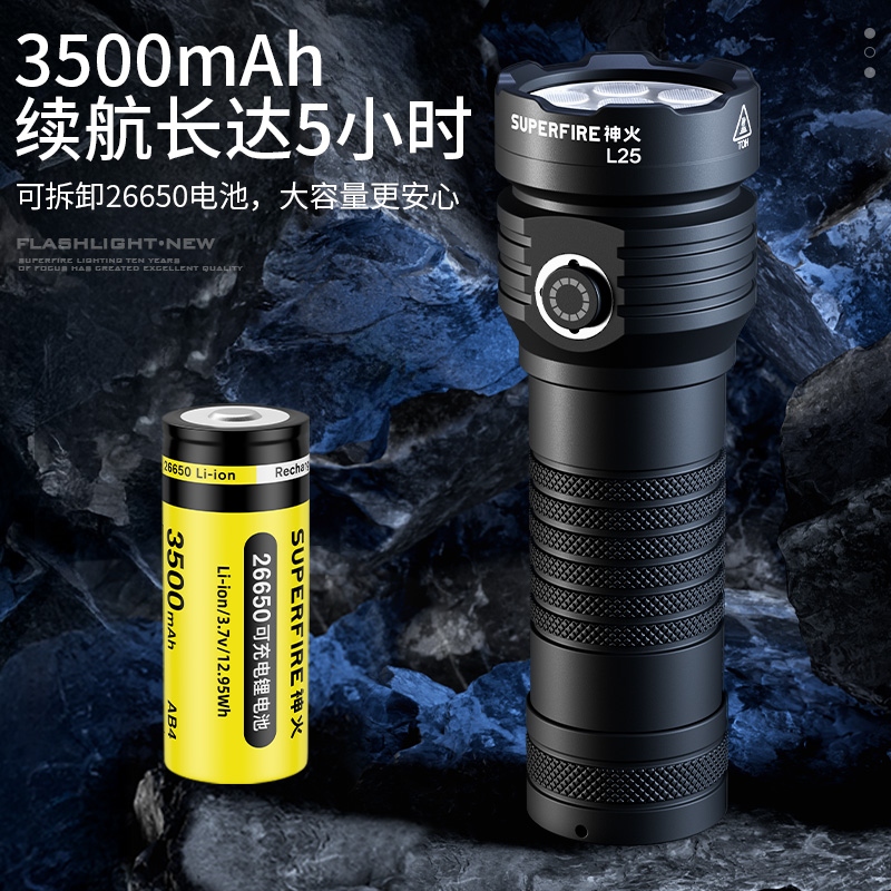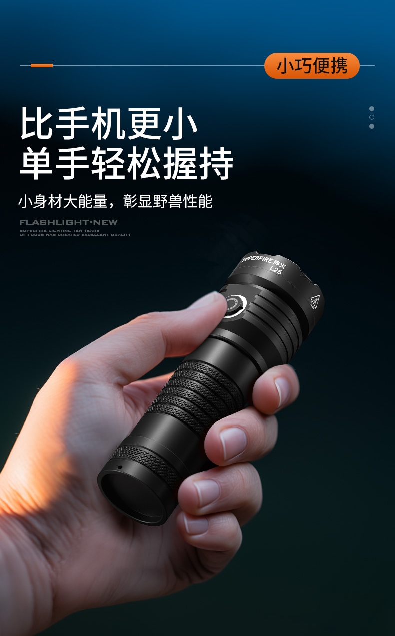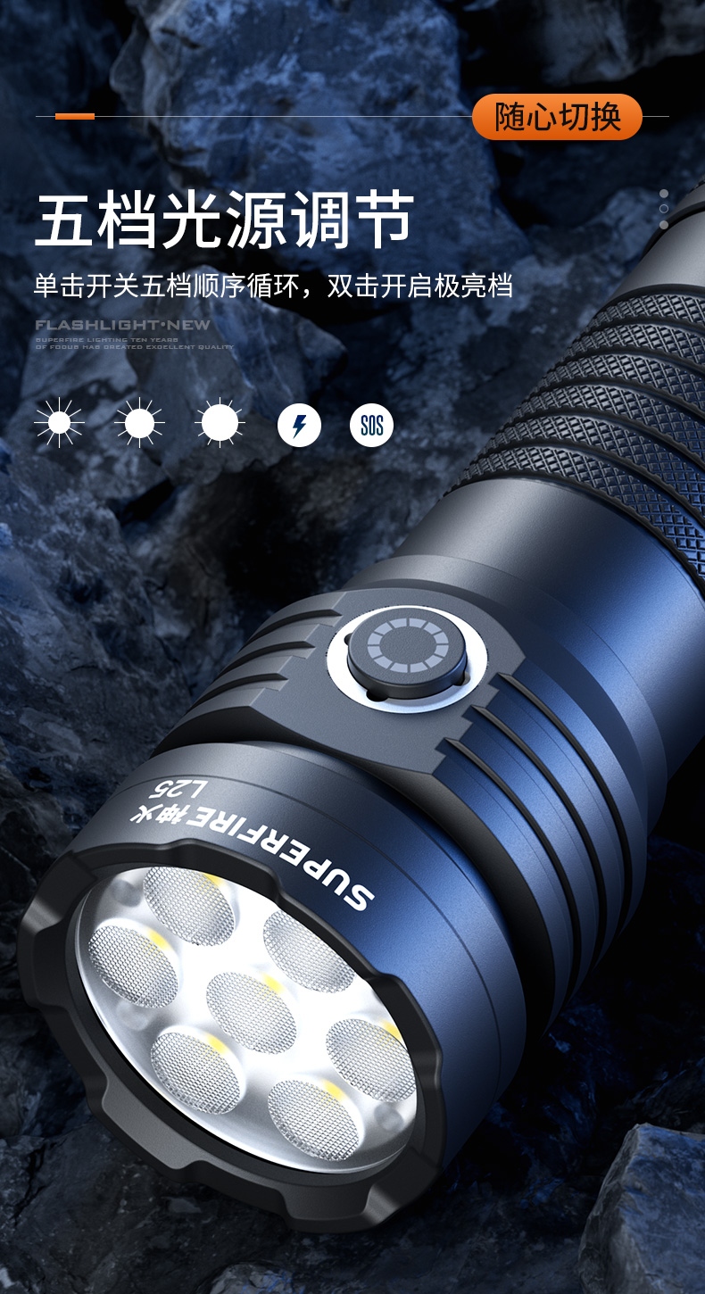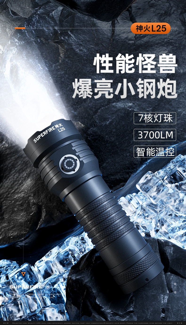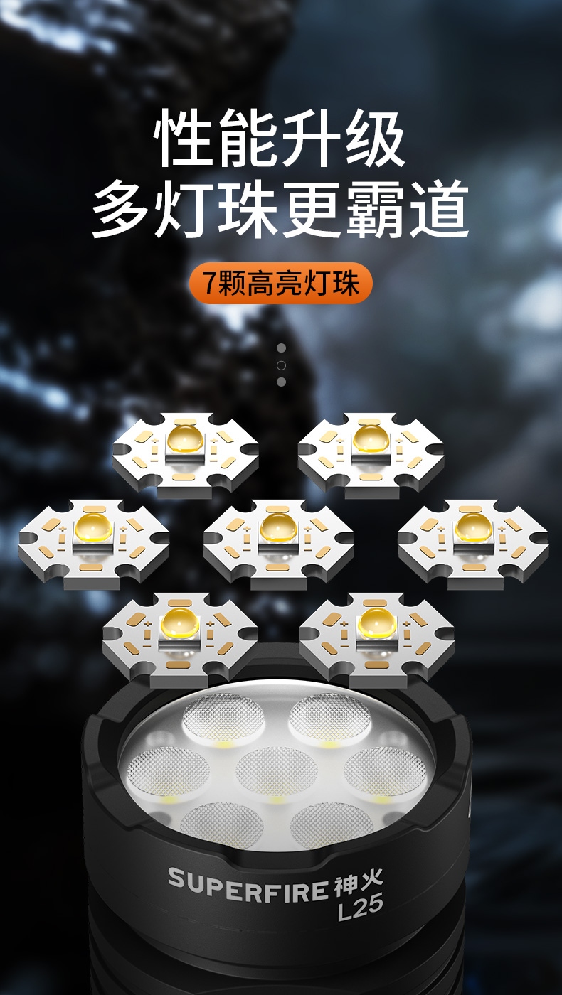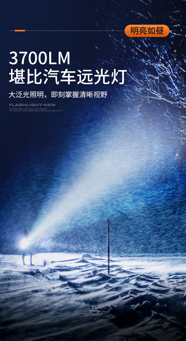 1、千米远射,射程更远,光斑更聚焦。 2、进口灯珠,亮度高,照明效果更好。 3、前后双按键,光源一键点亮,高亮瞬间开启。
