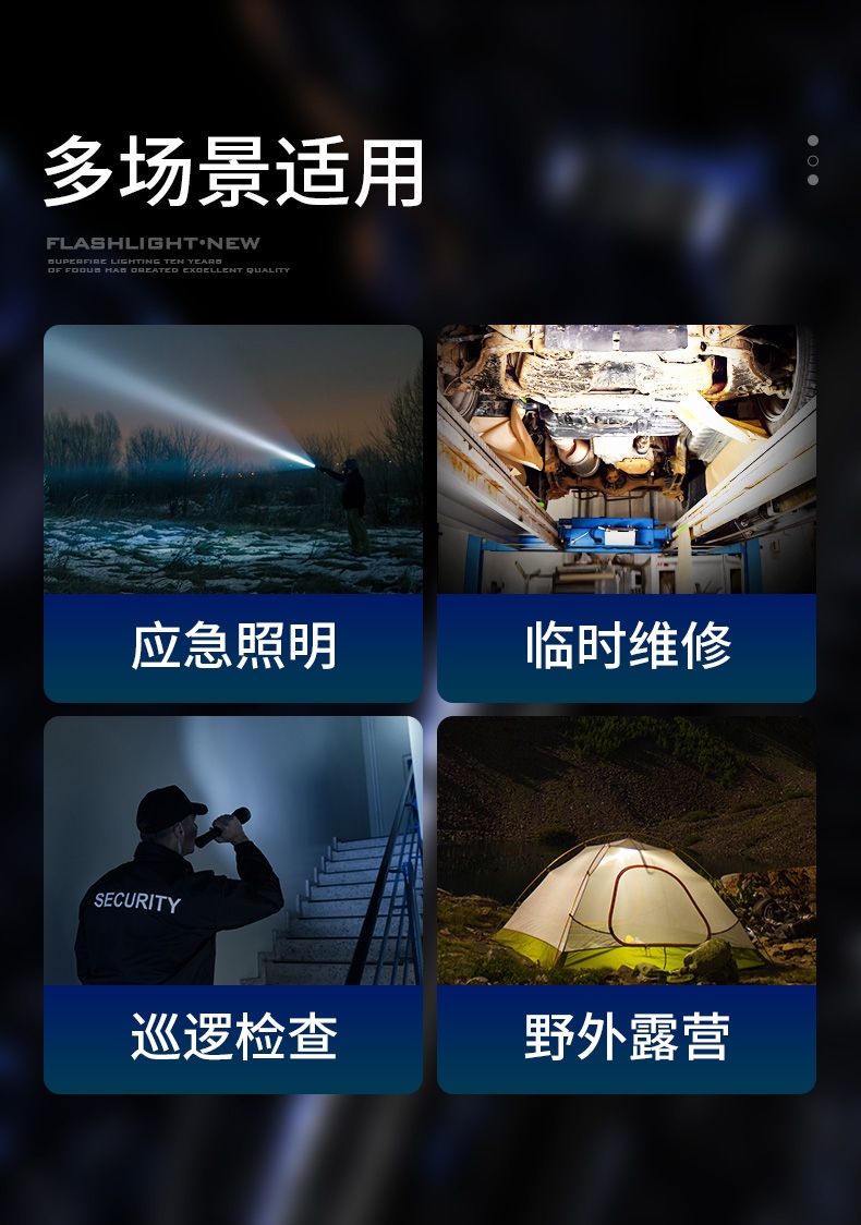 1、多档调光,可满足不同使用场景下的照明需求; 2、含提手,握感更舒适。携带更简单; 3、新型高亮远射灯珠,60W大功率,亮度高,照明效果好。