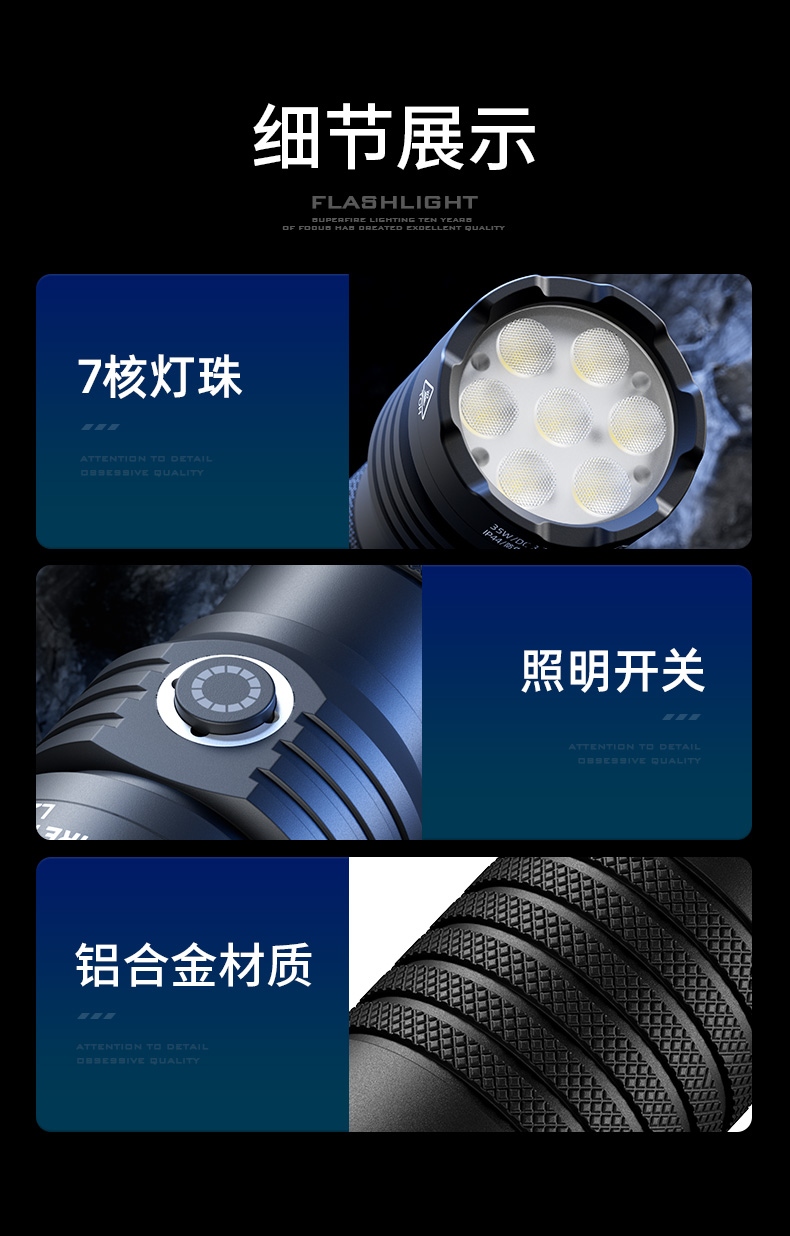 1、精致外观,含手绳,时尚小巧,方便携带。 2、7颗高亮灯珠,亮度高,照明效果更好。 3、多种安全程序,可有效保护手电使用安全,延长手电使用寿命。