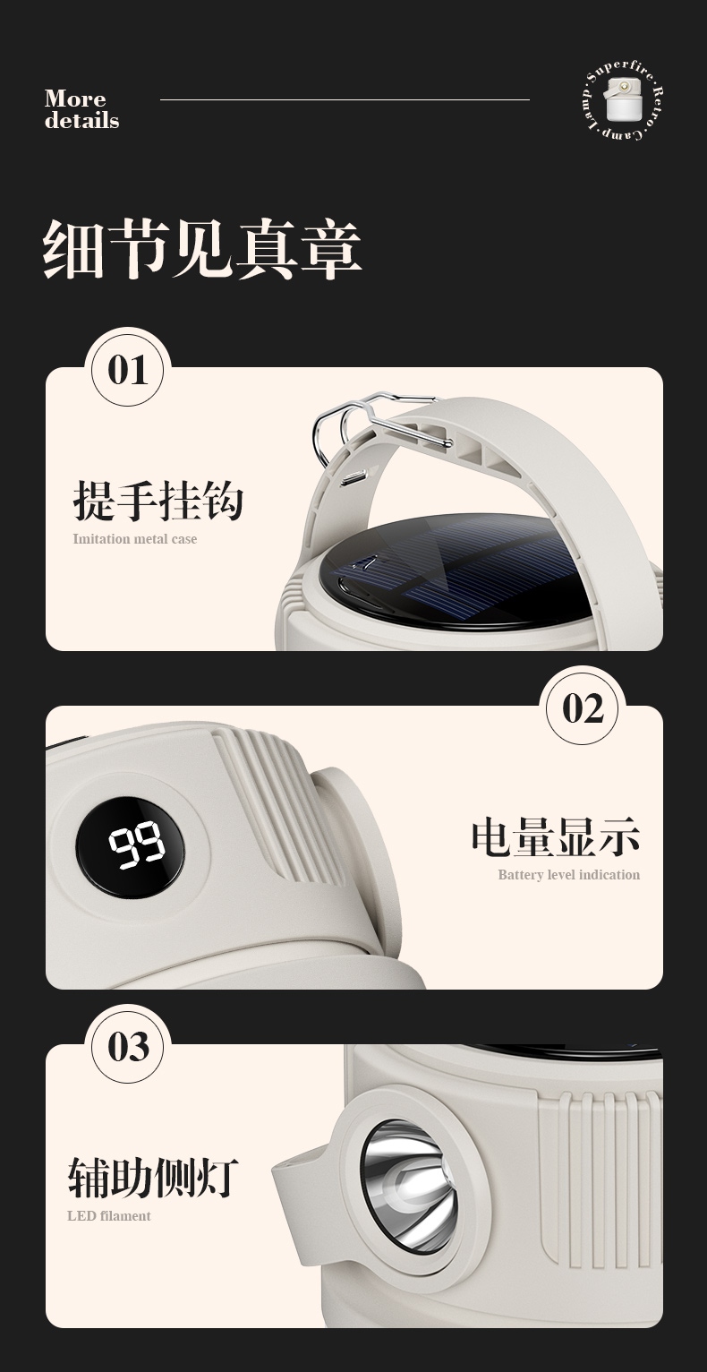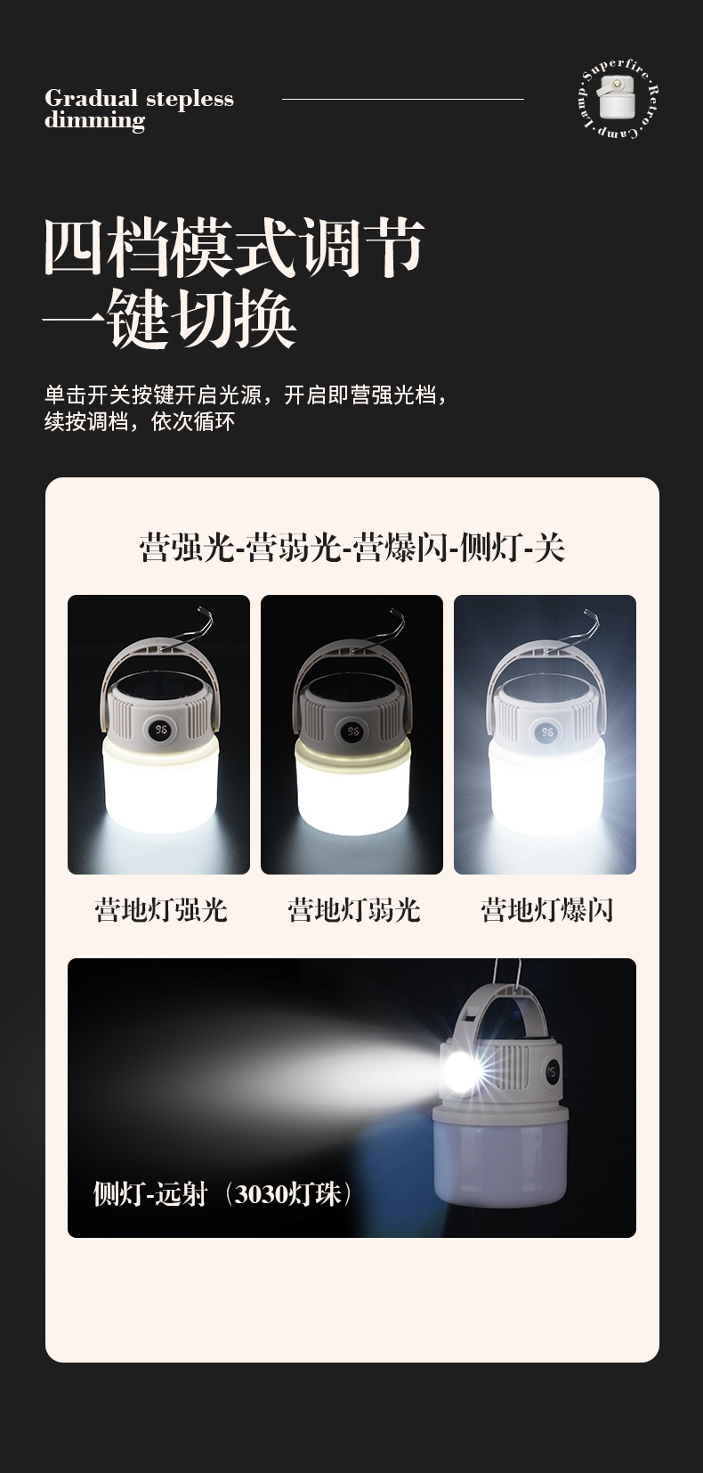 1、六档调光,可满足不同使用场景下的照明需求。 2、进口高亮朗明纳斯灯珠,照明效果更好。 3、含档位记忆,任意档位快捷关机 ,开机恢复关机前档位。