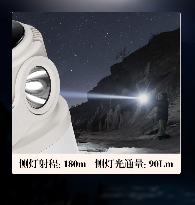 聚光主灯 亮度随心 轻按后端开关按钮,主灯强光点亮,续按依次切换主灯工作光-爆闪光。主灯开启状态下长按5秒,可实现光源色温转换。主灯关闭状态下长按5秒,可开启灯具最亮照明模式。 爆亮强光 亮如白昼 1500LM大功率高亮光源,点亮顷刻如白昼