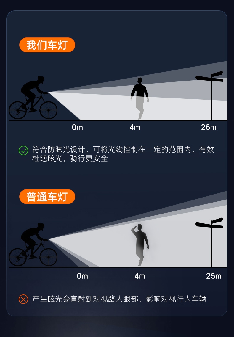 2.防眩光设计,可将光线控制在一定的范围内,有效杜绝眩光,骑行更安全;