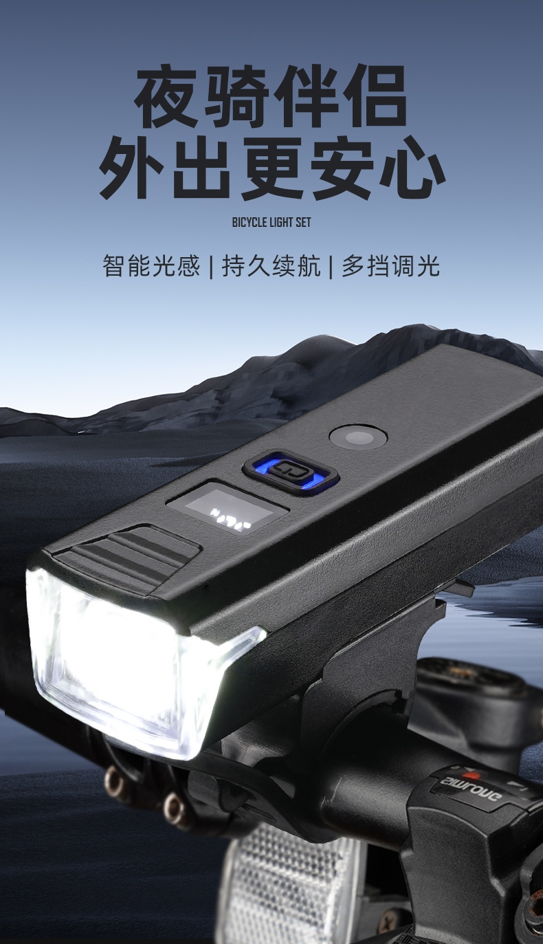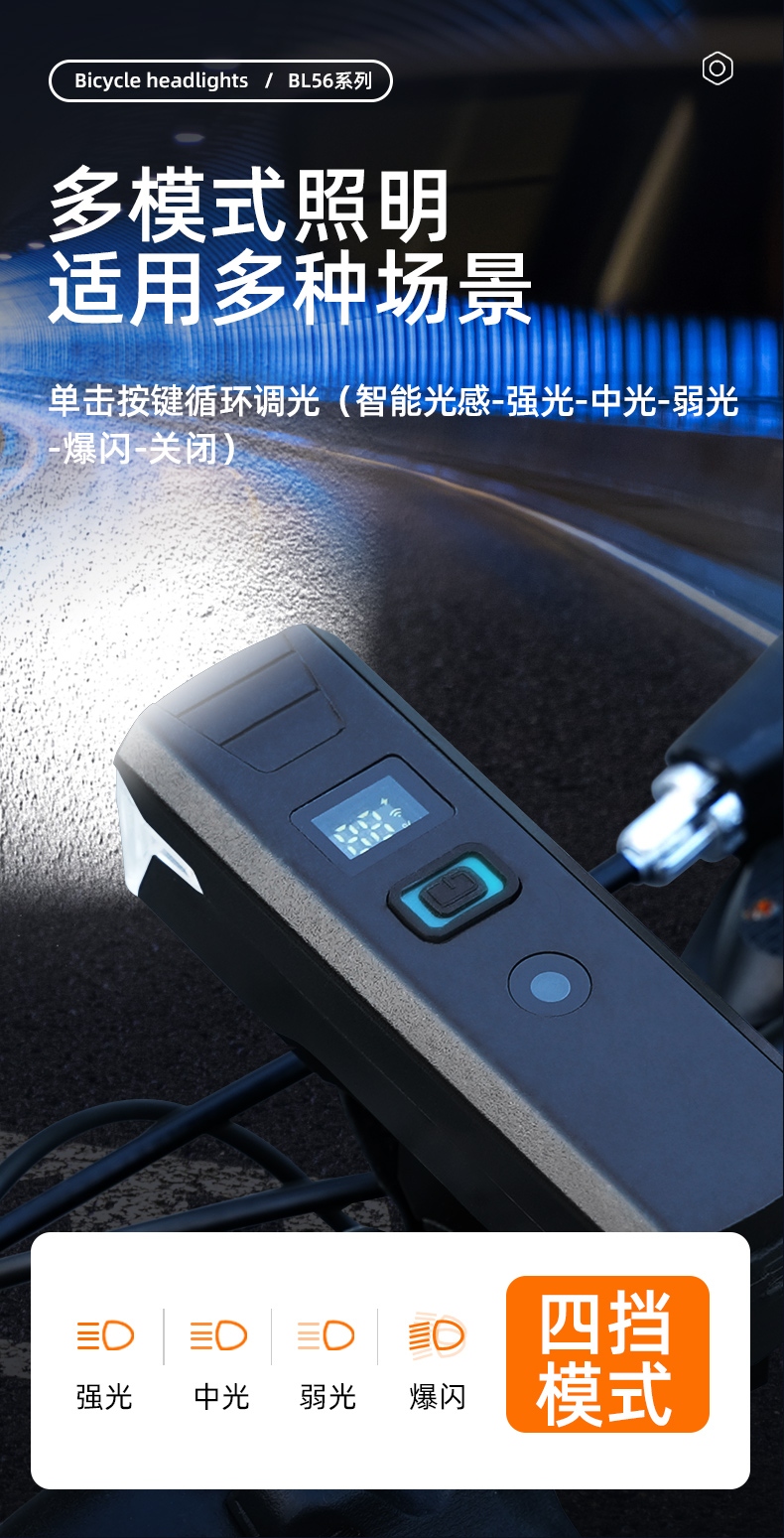 1.多模式照明适用多种场景,单击按键循环调光(智能光感-强光-中光-弱光-爆闪-关闭); 2.防眩光设计,可将光线控制在一定的范围内,有效杜绝眩光,骑行更安全; 3.工程塑料机身,从容面对恶劣环境,防腐耐磨;