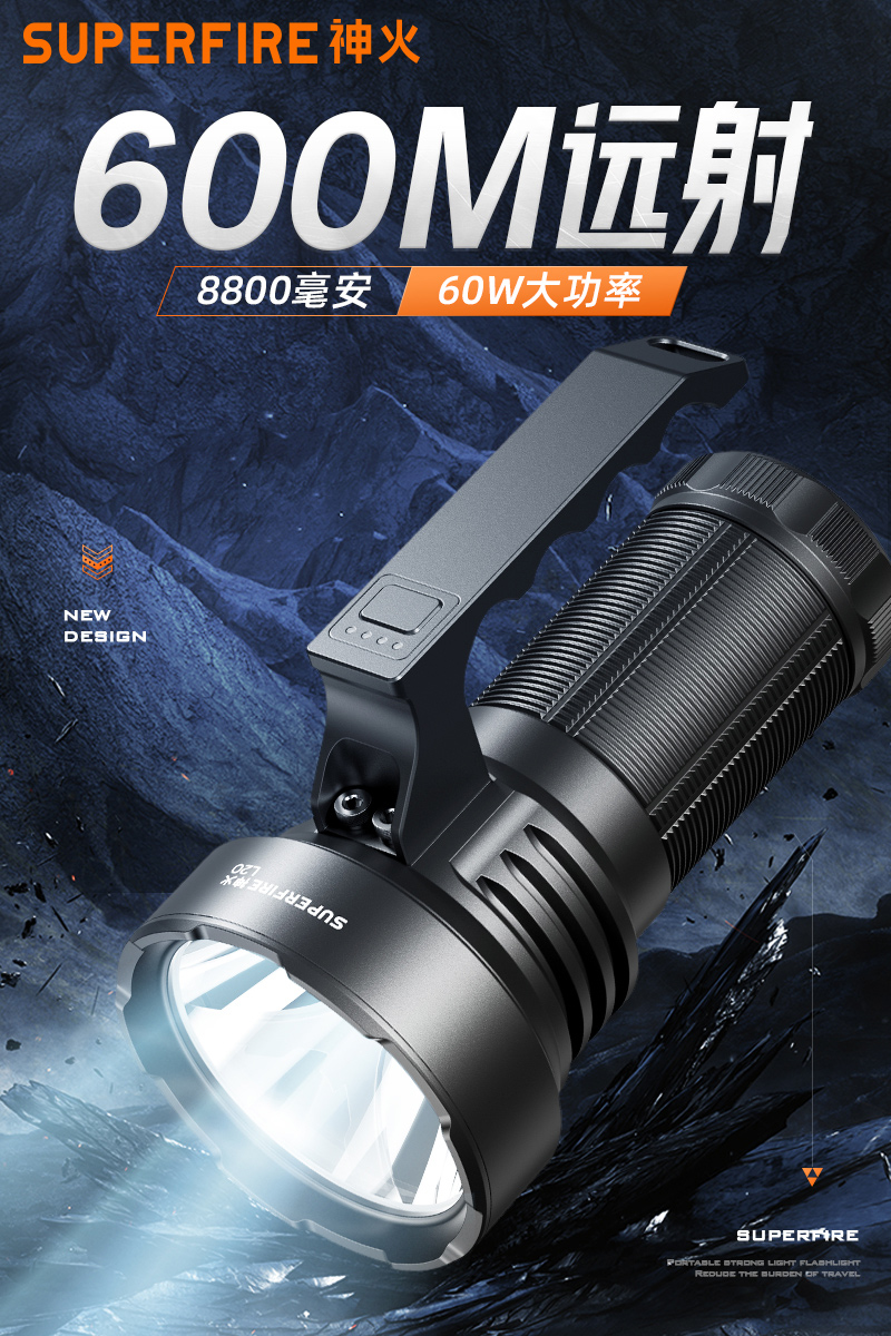 夜间户外探险时,大部分情况下除了微弱的自然光线外,很难再有其他光源,此时普通低流明手电便无法完全满足户外需求。神火推出的L20强光手电功率高达60W,配合定焦大光杯,最高光通量可达5000LM,瞬间点亮黑夜,大范围覆盖照明,掌握大片视野。600m的远射距离,让远处目标清晰可见。无论是深山徒步、野外露营,还是在广阔草原上,它都能为你照亮前行的道路。
