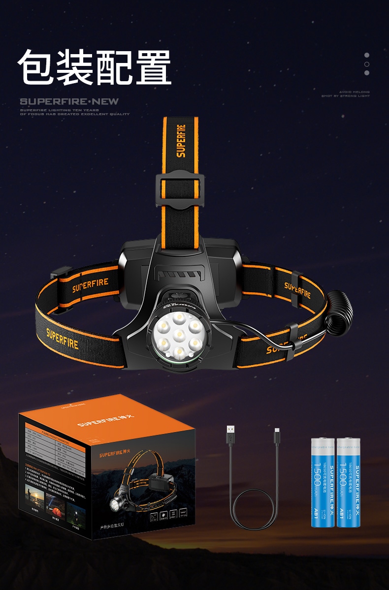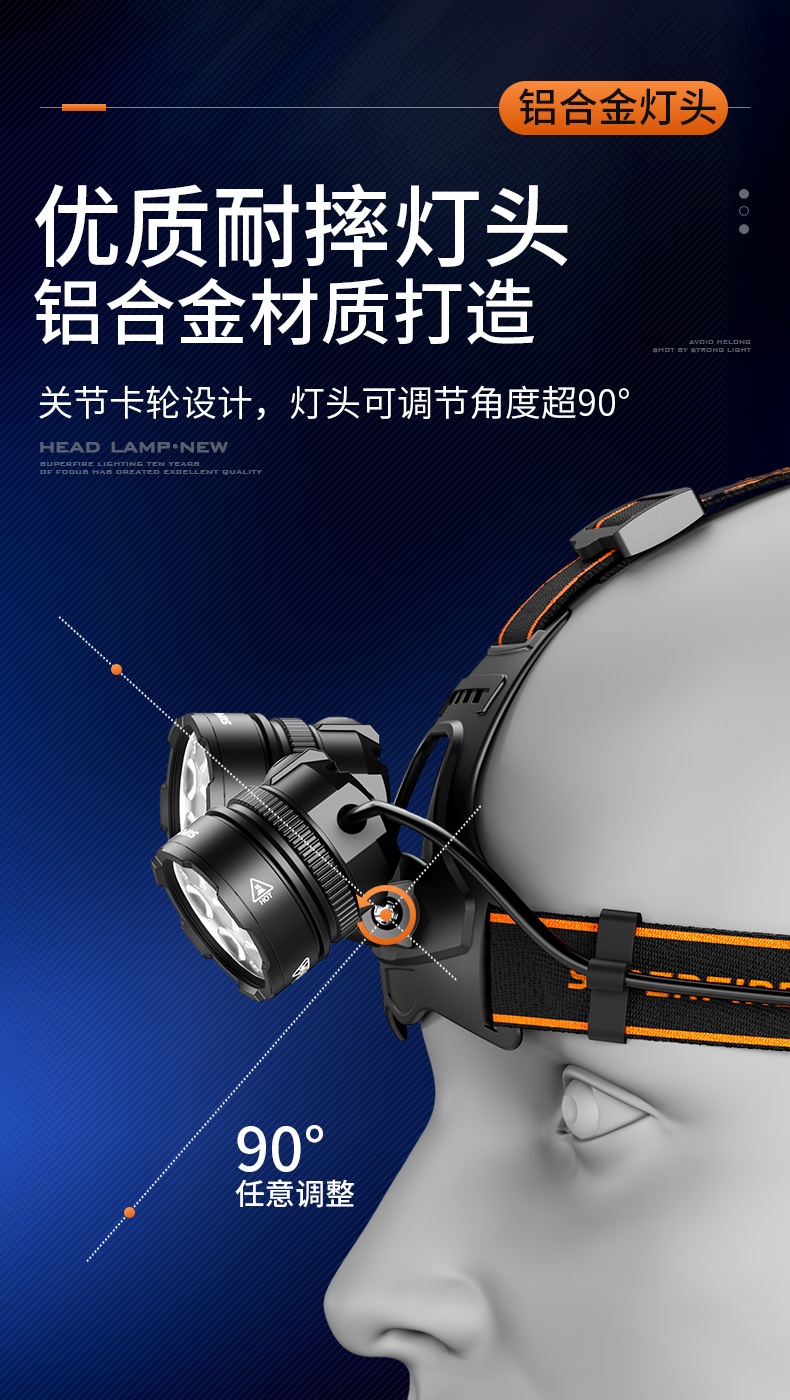 强光亮度,运动头灯,前后均衡设计,轻便不压头,可调节式头灯带,佩戴方便舒适,伸缩调焦,光照范围大,照射距离远,头灯角度调节,超90度角度随意调节,适宜各种环境使用