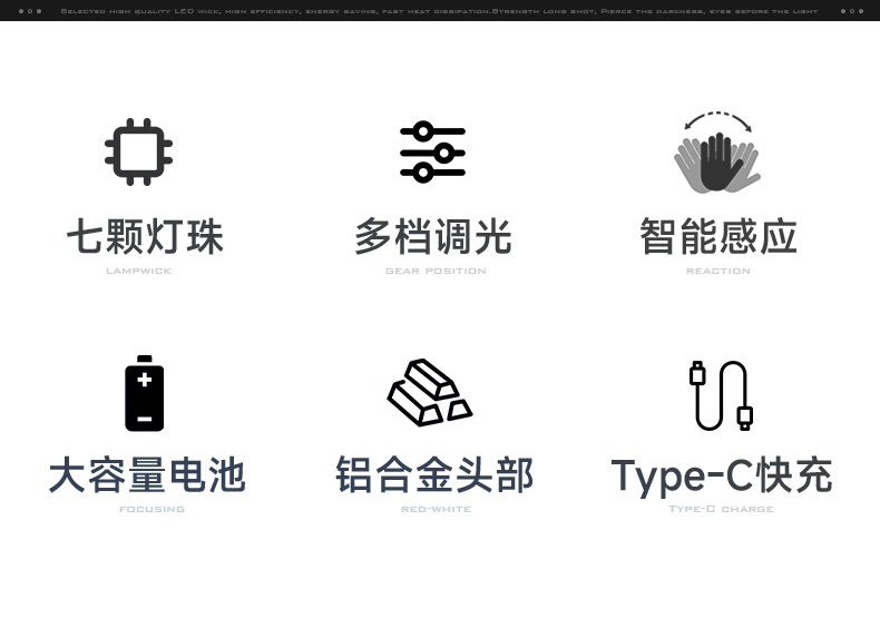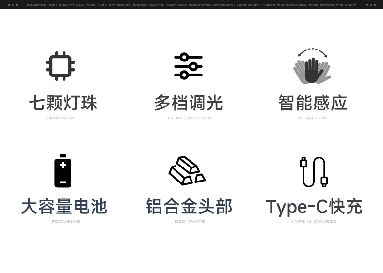 1、六档调光,可满足不同使用场景下的照明需求。 2、进口高亮朗明纳斯灯珠,照明效果更好。 3、含档位记忆,任意档位快捷关机 ,开机恢复关机前档位。
