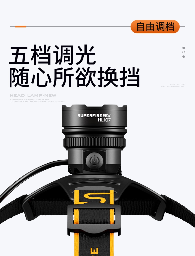 1、五档一体:弱中强、爆闪、SOS自由切换,可满足不同场景下的使用需求;