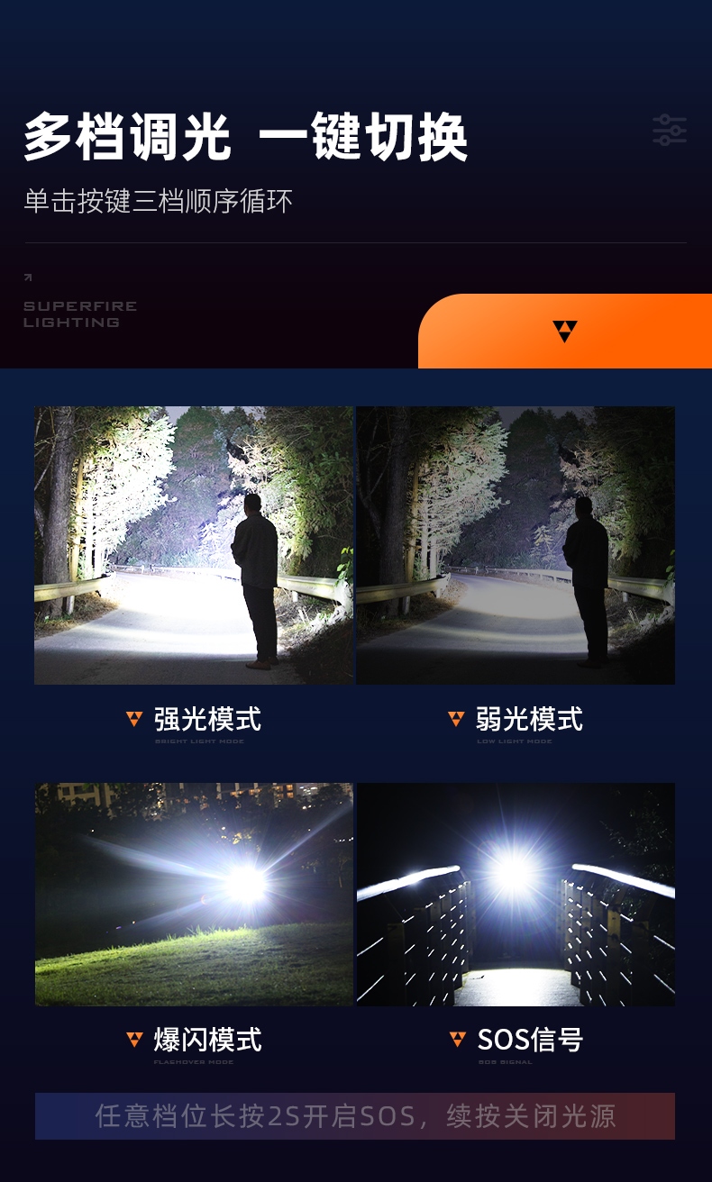 1、按压尾部开关即开启强光档,续按调档(强光-弱光-爆闪-关),任何档位长按3s即开启 SOS档位,续按关闭光源。