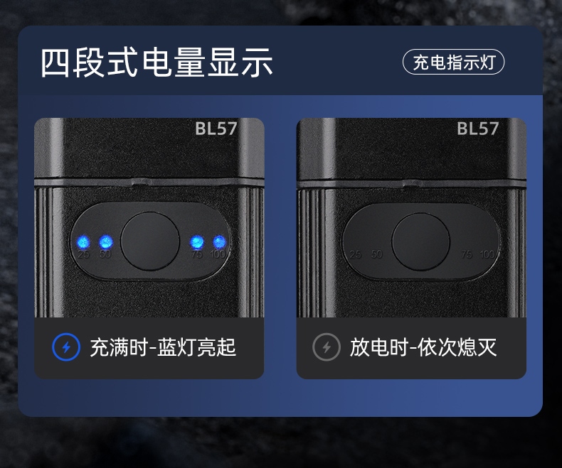 5、四段式电量显示,充满时-蓝灯亮起,放电时-依次熄灭;