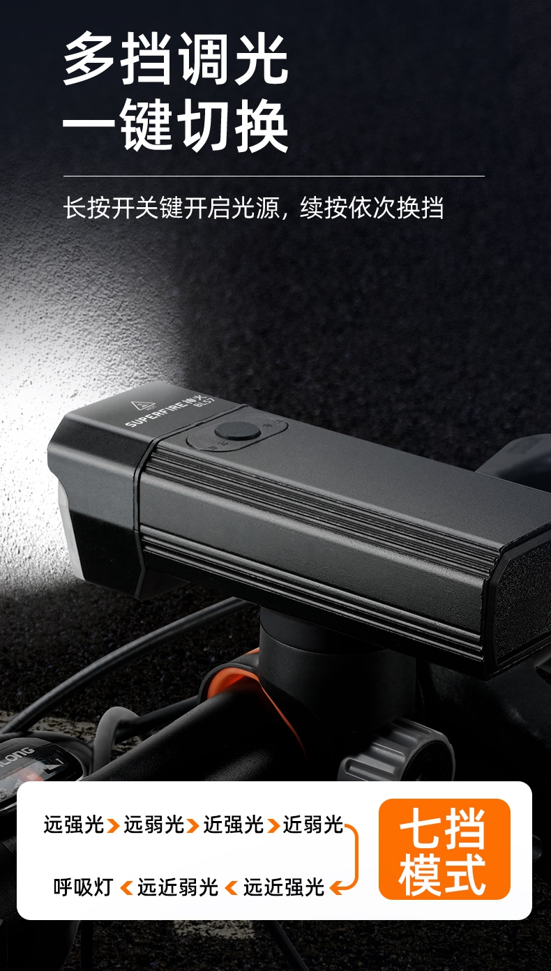 1、双灯设计,远近尽在掌握,不晃人眼,适合城市的光学设计,骑行更安全; 2、七挡调光,一键切换,长按开关键开启光源,续按依次换挡; 3、IP54级防水,雨天自在骑行,潮湿雨季依旧光亮。