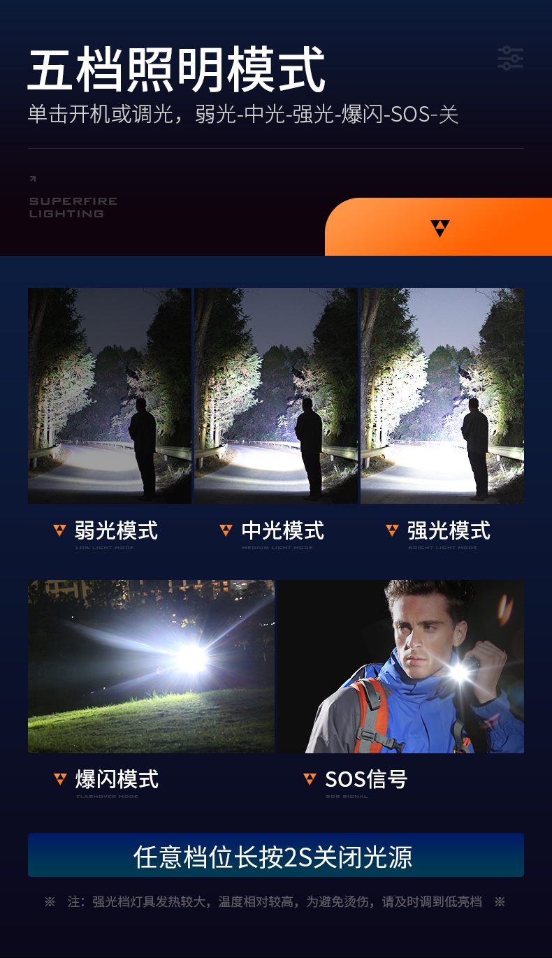 聚光主灯 亮度随心 轻按后端开关按钮,主灯强光点亮,续按依次切换主灯工作光-爆闪光。主灯开启状态下长按5秒,可实现光源色温转换。主灯关闭状态下长按5秒,可开启灯具最亮照明模式。 爆亮强光 亮如白昼 1500LM大功率高亮光源,点亮顷刻如白昼