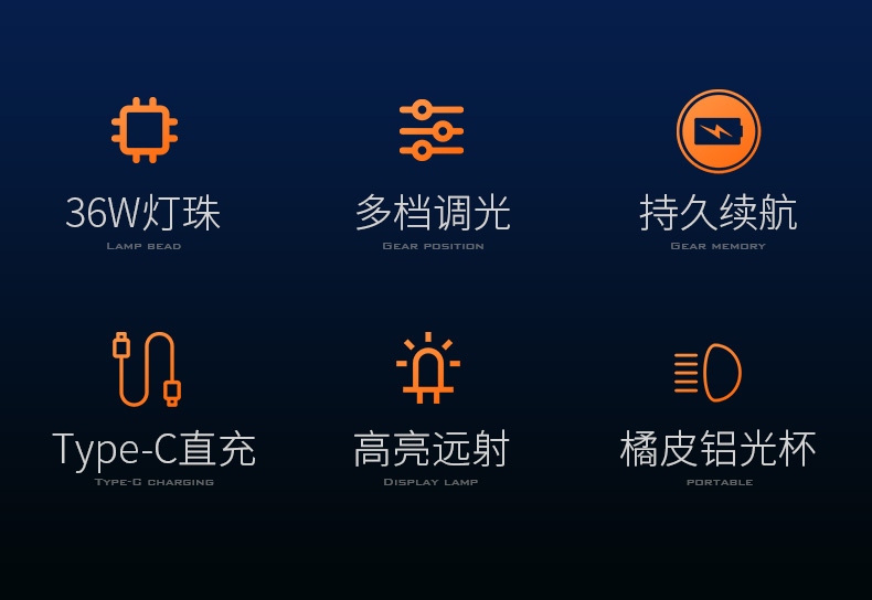 1、六档调光,可满足不同使用场景下的照明需求。 2、进口高亮朗明纳斯灯珠,照明效果更好。 3、含档位记忆,任意档位快捷关机 ,开机恢复关机前档位。