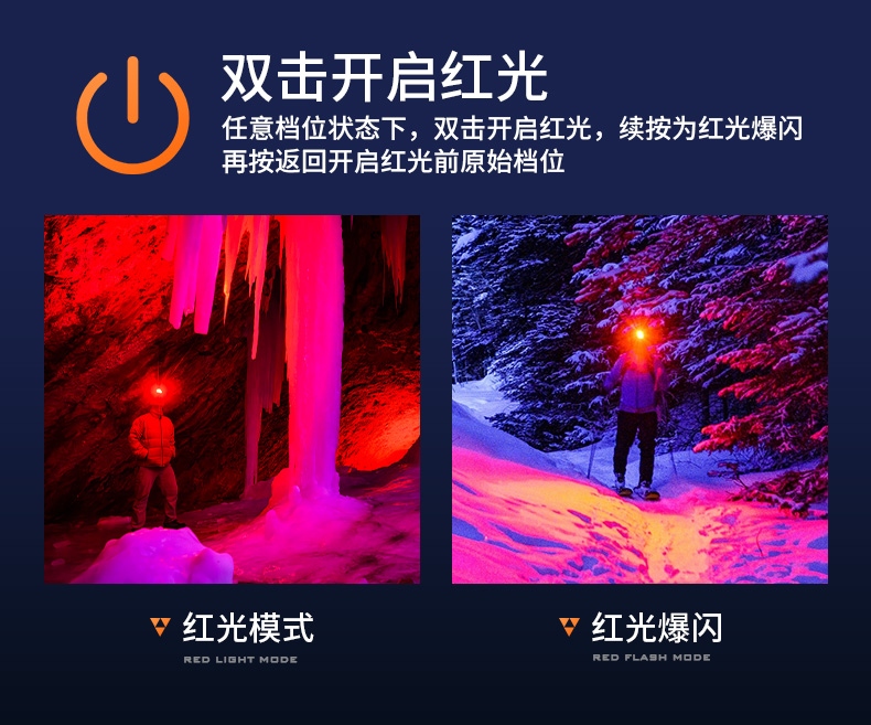 闪,再按返回开启红光档位时原始档位(如在关闭状态下开启红光,续按为红光爆闪,再按为关闭状态),任意档位长按可关闭光源。