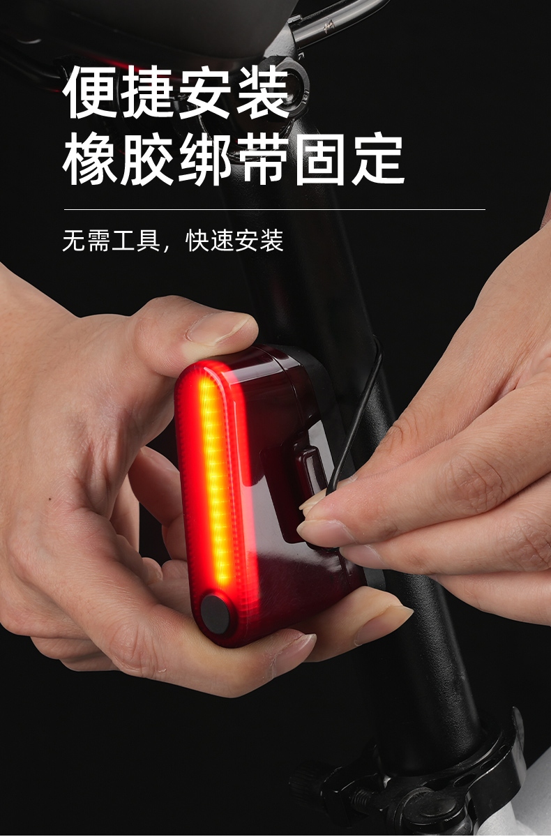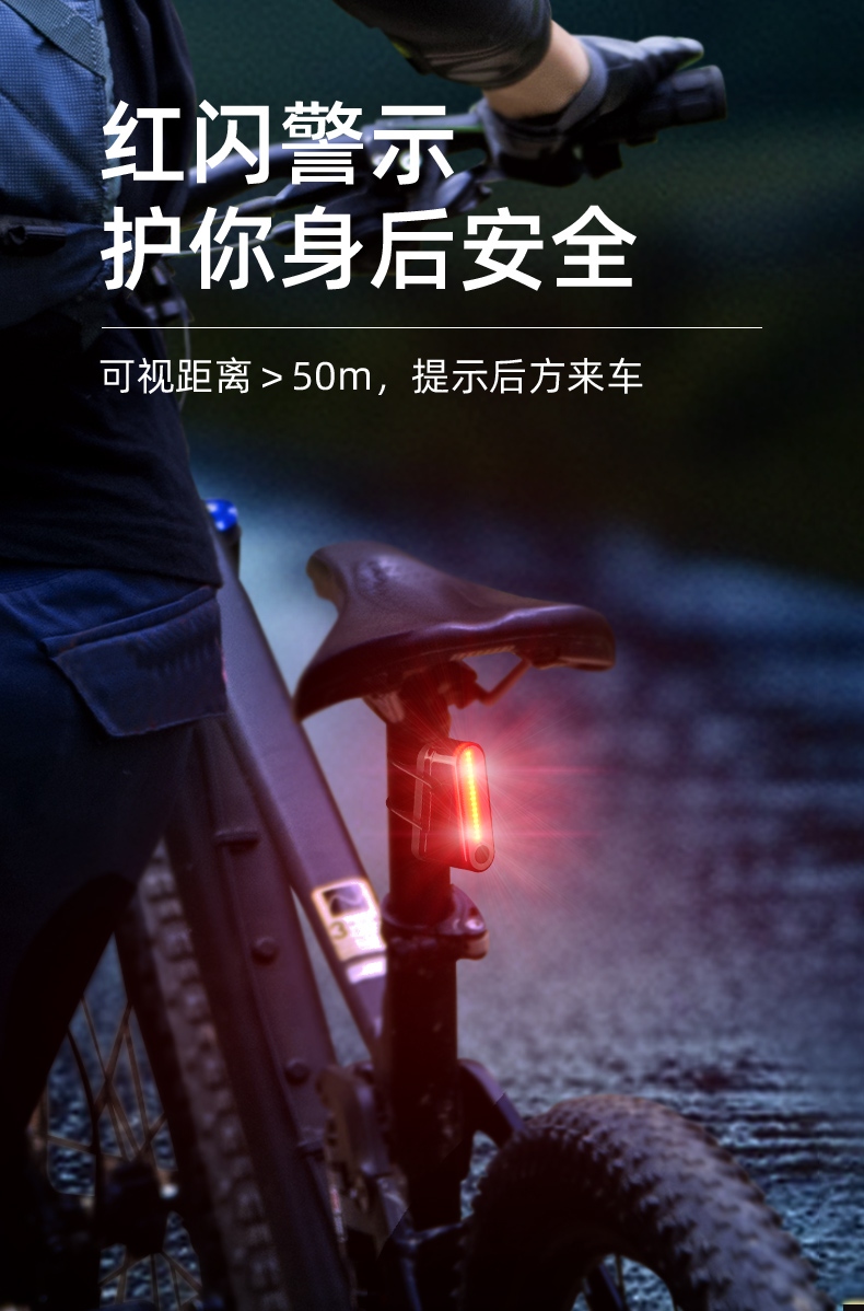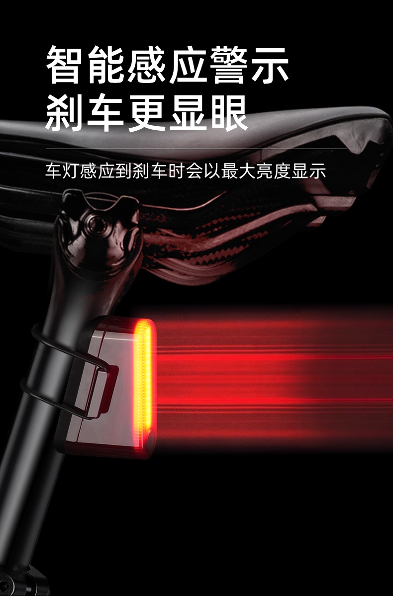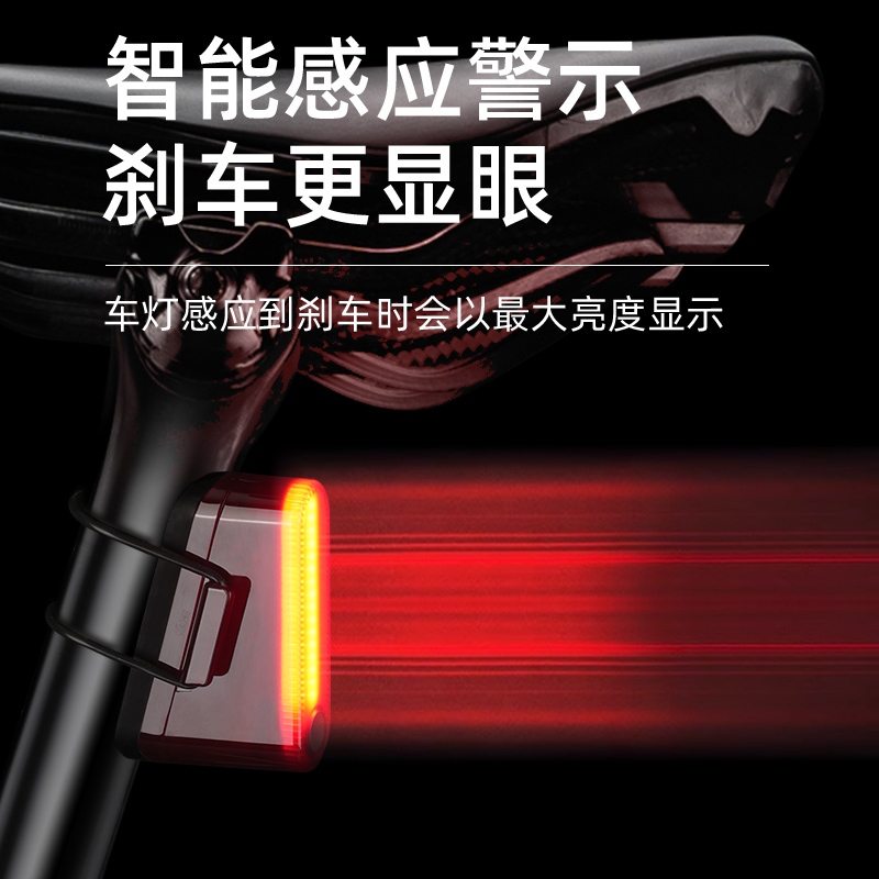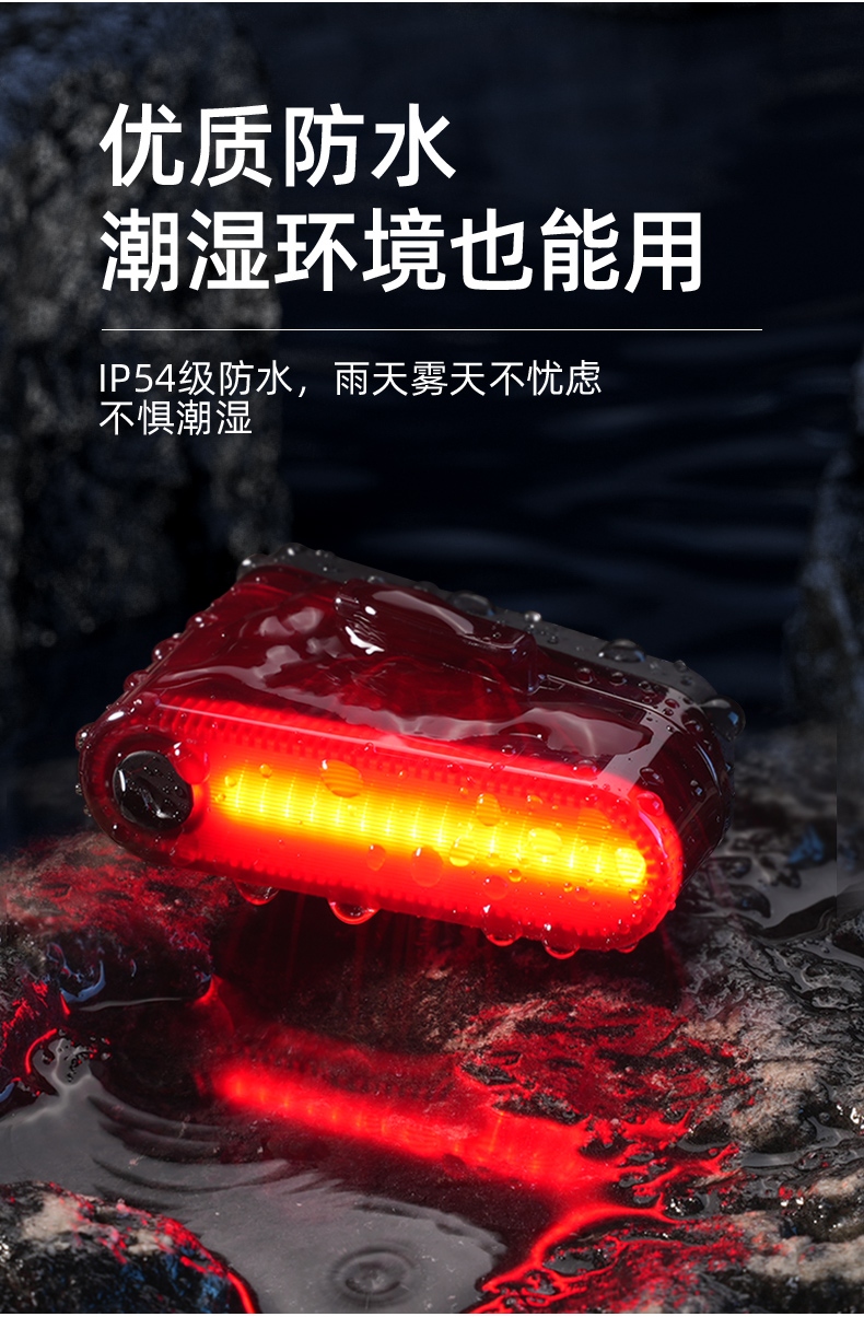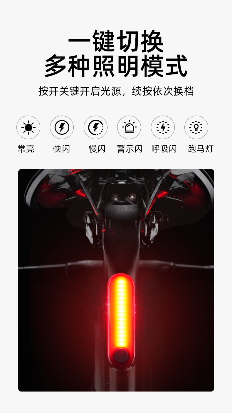 1、红闪警示,护你身后安全,可视距离>50m,提示后方来车; 2、多种照明模式,一键切换,按开关键开启光源,续按依次换档; 3、智能感应警示,刹车更显眼,车灯感应到刹车时会以最大亮度显示;