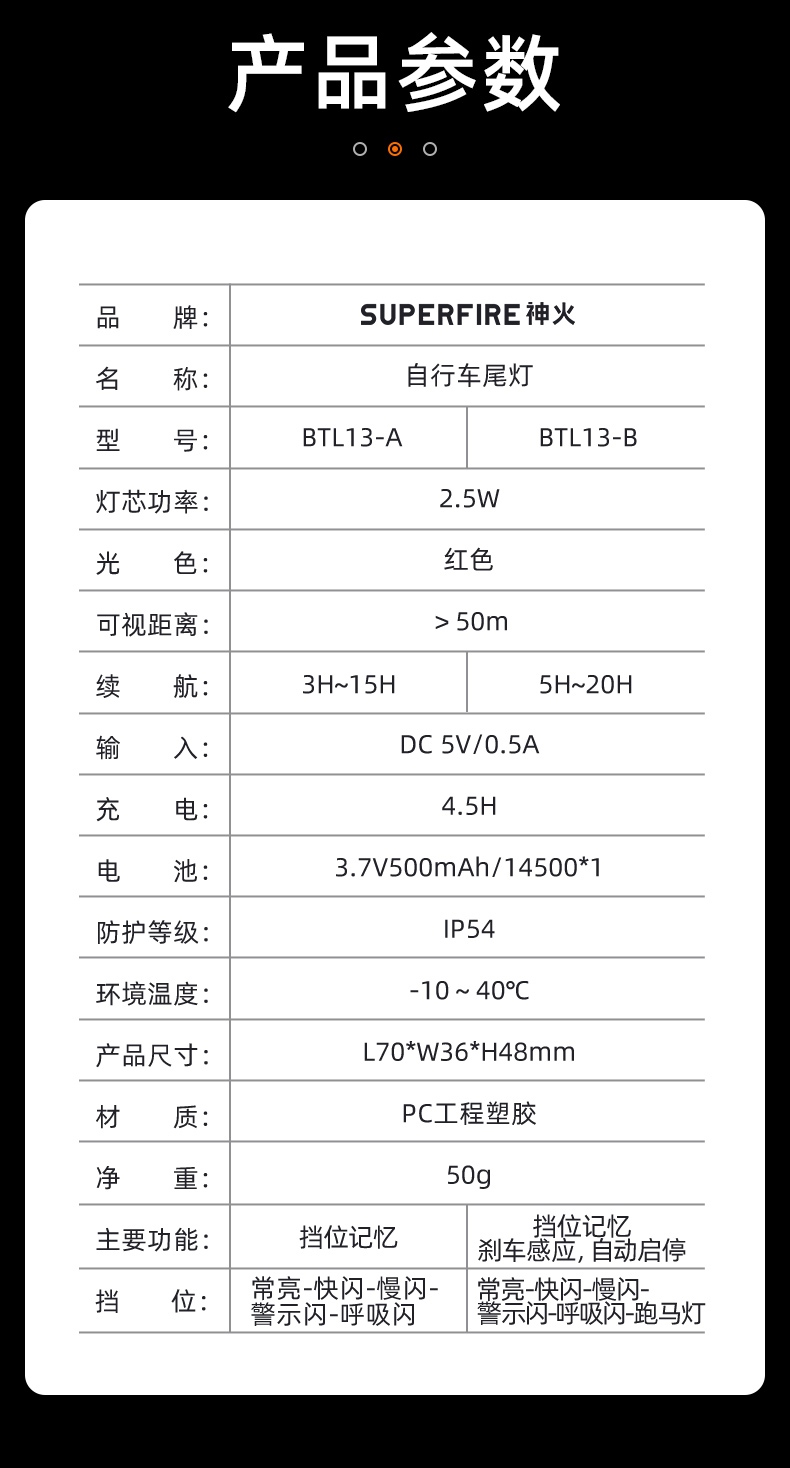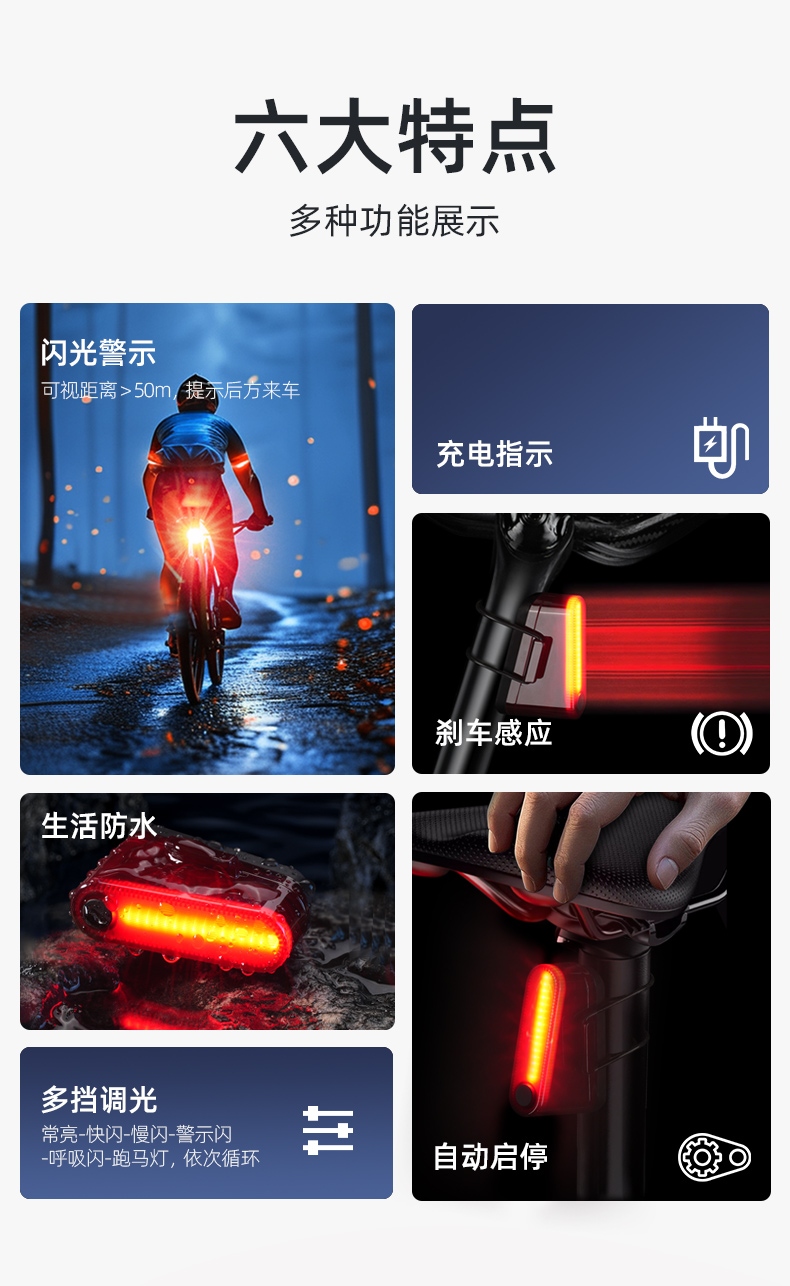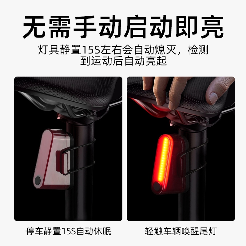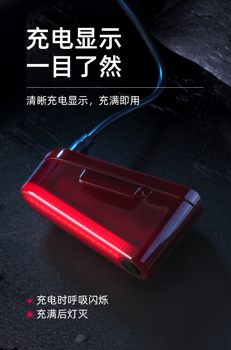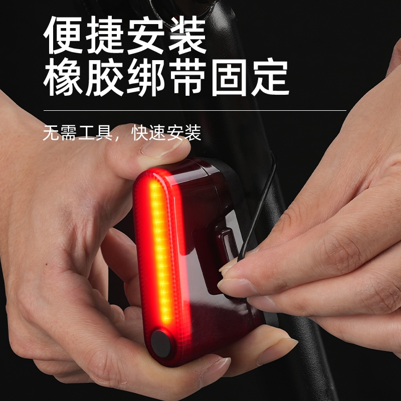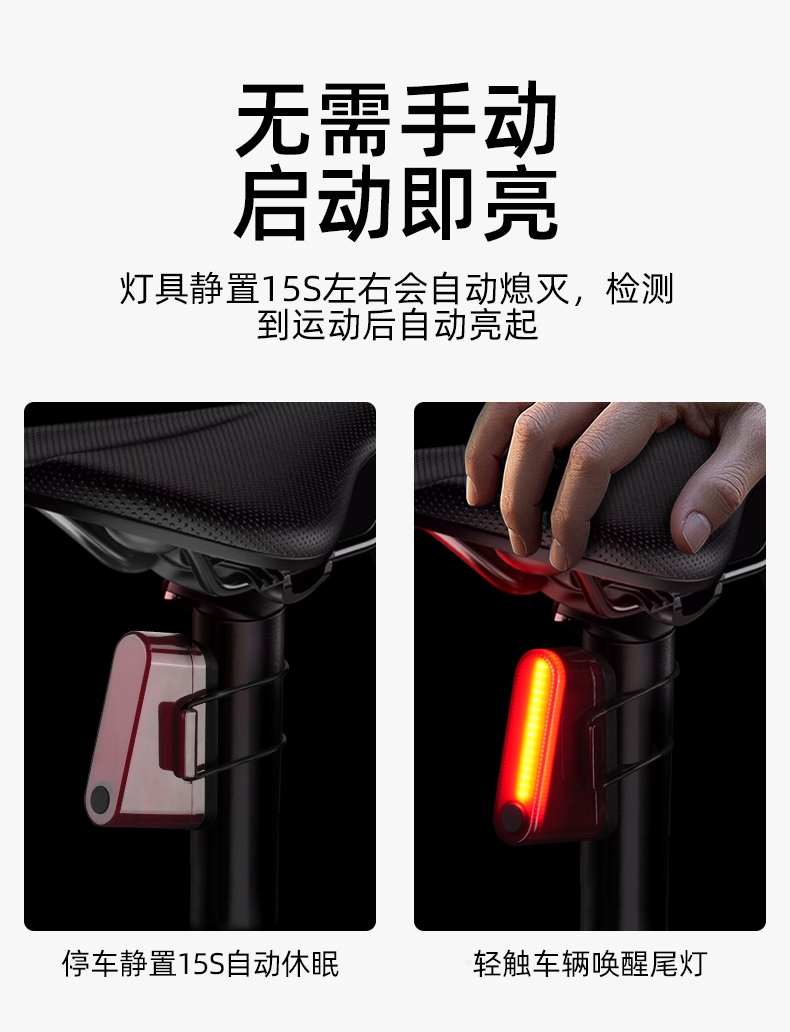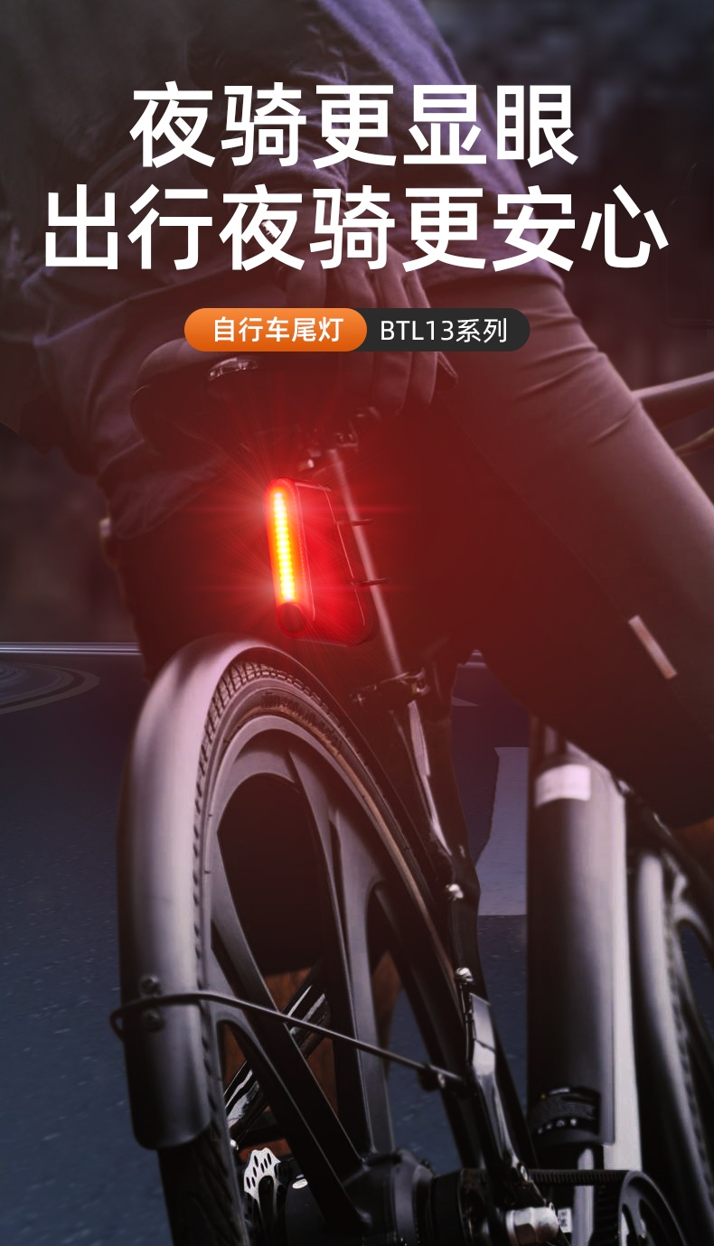 1、红闪警示,护你身后安全,可视距离>50m,提示后方来车; 2、多种照明模式,一键切换,按开关键开启光源,续按依次换档; 3、智能感应警示,刹车更显眼,车灯感应到刹车时会以最大亮度显示;