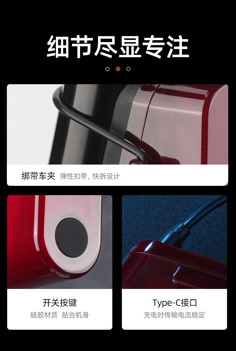 1、红闪警示,护你身后安全,可视距离>50m,提示后方来车;