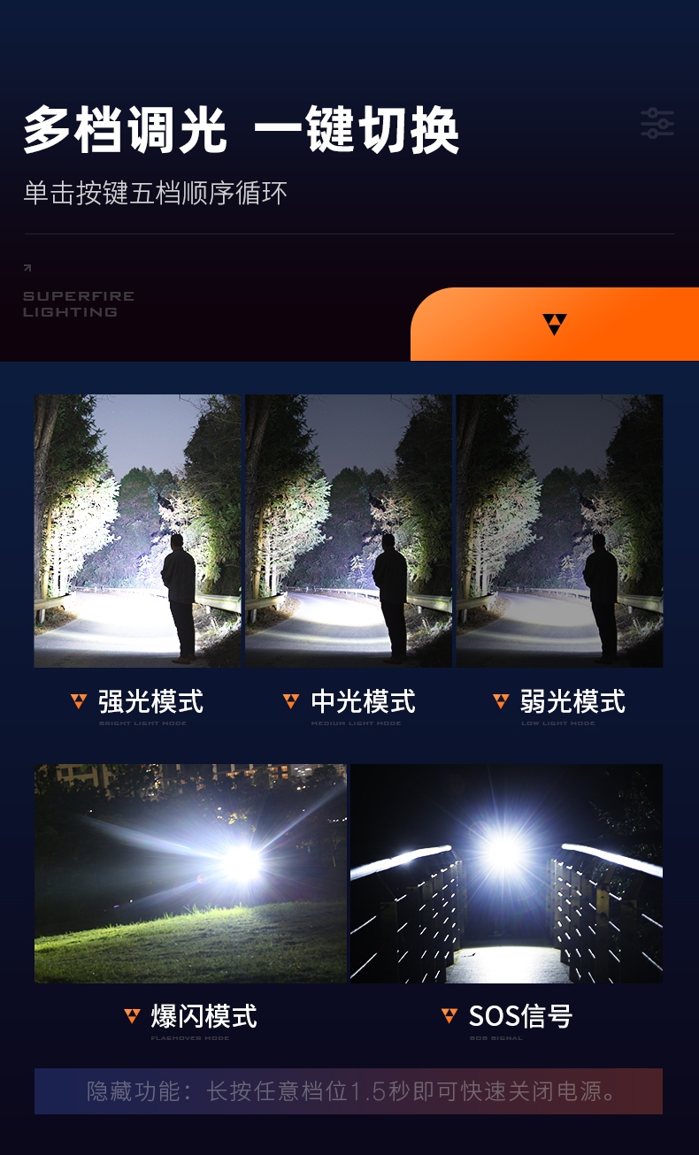 聚光主灯 亮度随心 轻按后端开关按钮,主灯强光点亮,续按依次切换主灯工作光-爆闪光。主灯开启状态下长按5秒,可实现光源色温转换。主灯关闭状态下长按5秒,可开启灯具最亮照明模式。 爆亮强光 亮如白昼 1500LM大功率高亮光源,点亮顷刻如白昼