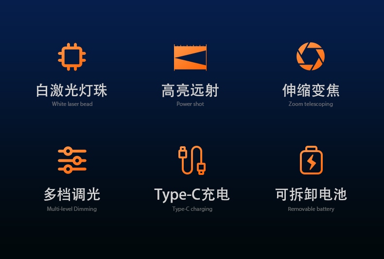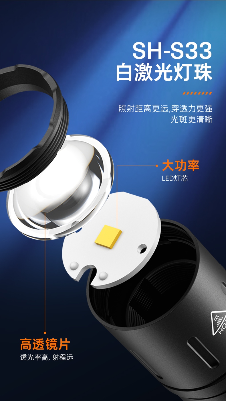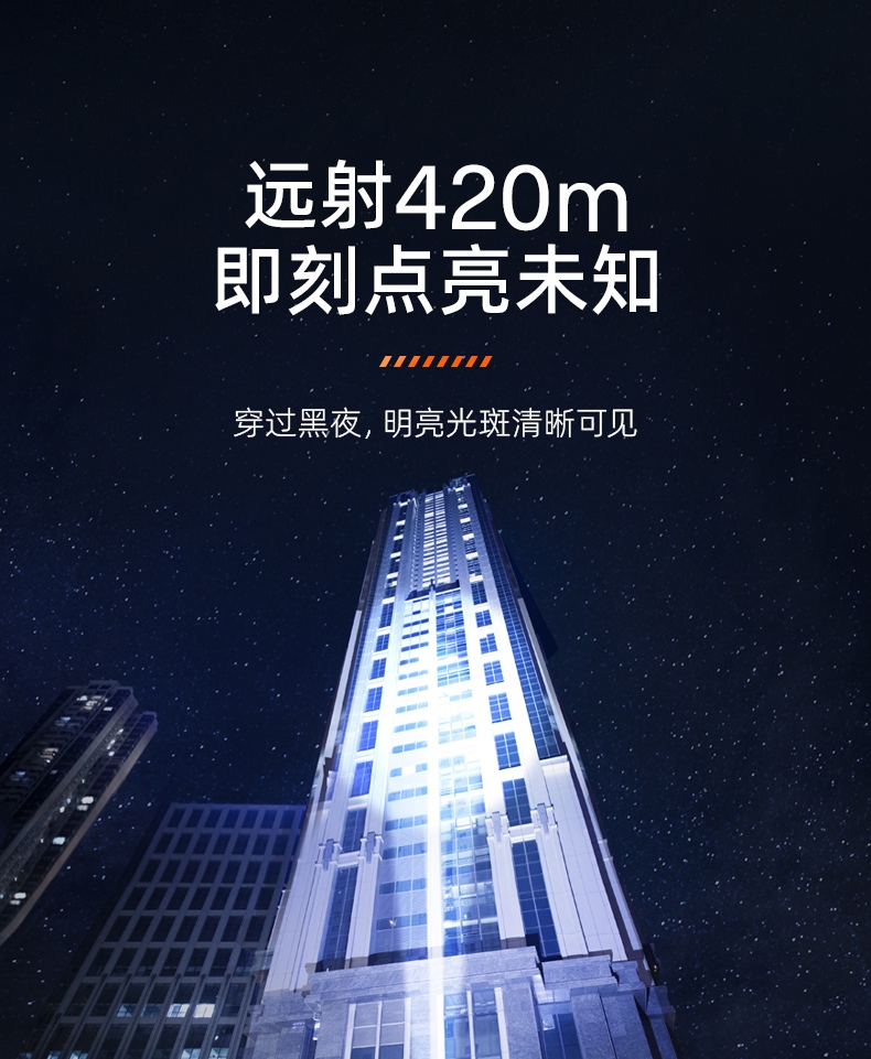1、千米远射,射程更远,光斑更聚焦。 2、进口灯珠,亮度高,照明效果更好。 3、前后双按键,光源一键点亮,高亮瞬间开启。
