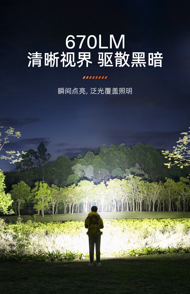 聚光主灯 亮度随心 轻按后端开关按钮,主灯强光点亮,续按依次切换主灯工作光-爆闪光。主灯开启状态下长按5秒,可实现光源色温转换。主灯关闭状态下长按5秒,可开启灯具最亮照明模式。 爆亮强光 亮如白昼 1500LM大功率高亮光源,点亮顷刻如白昼