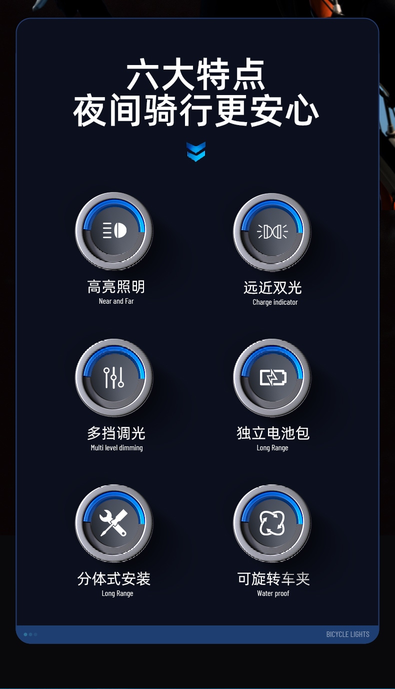 车灯设有远光和近光前后两个按钮,操作如下: 单击前按钮开启远光,挡位依次为:远强光-远中光-远弱光-快闪-SOS-关闭 单击后按钮开启近光,挡位依次为:近强光-近中光-近弱光-快闪-SOS-关闭 前后按钮任意双击开启远近光,挡位依次为:: 远近强光-远近中光-