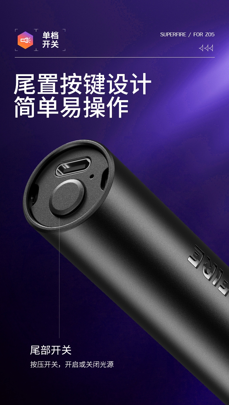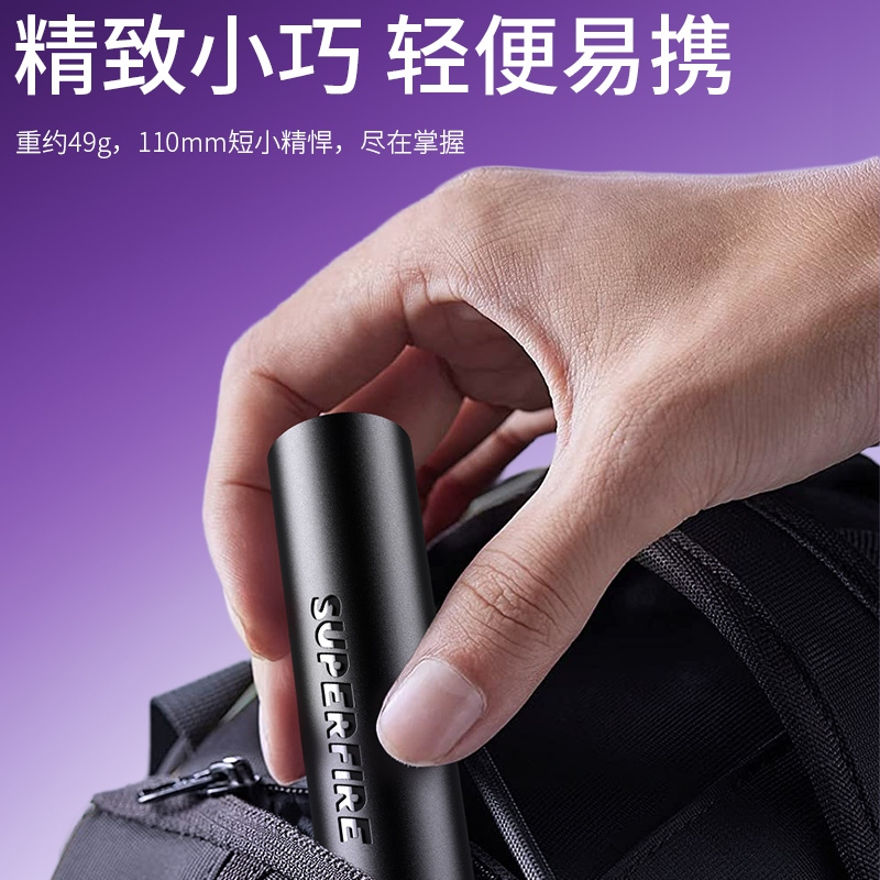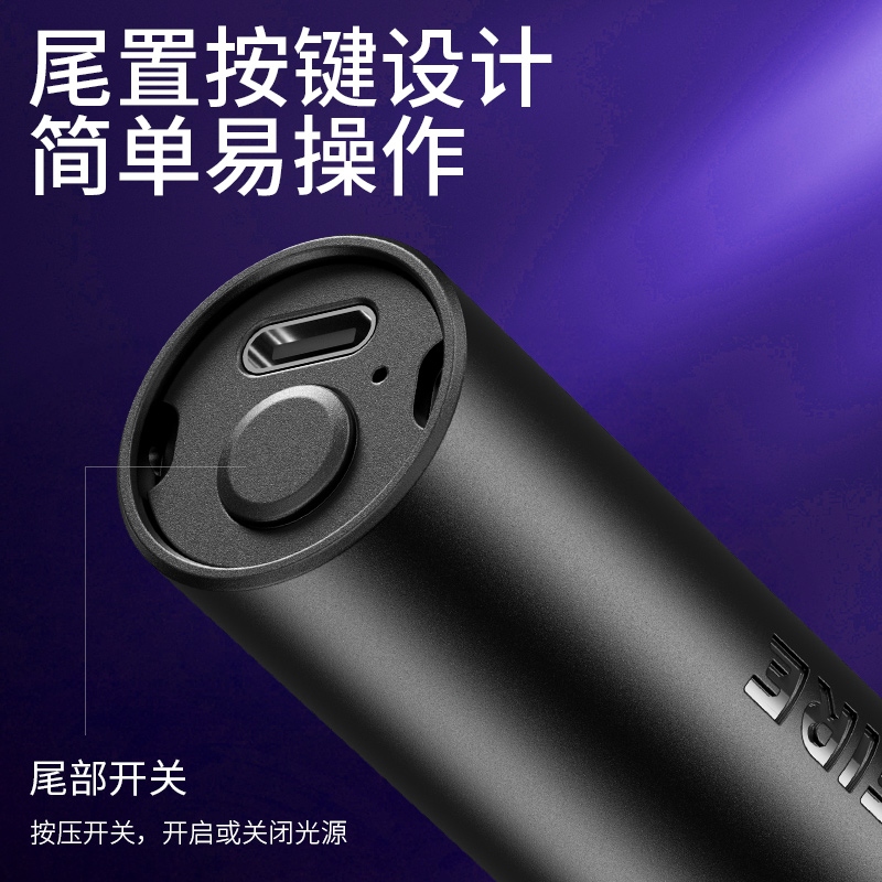 1、紫光手电:可用于验钞、识别荧光剂,宠物荧光检测,鉴别琥珀、蜜蜡,古玩修补鉴定。 2、单档开关,操作便捷。 3、多样化充电,使用方便:设有Type-C充电接口,可使用充电器、充电宝、电脑等设备为手电充电。
