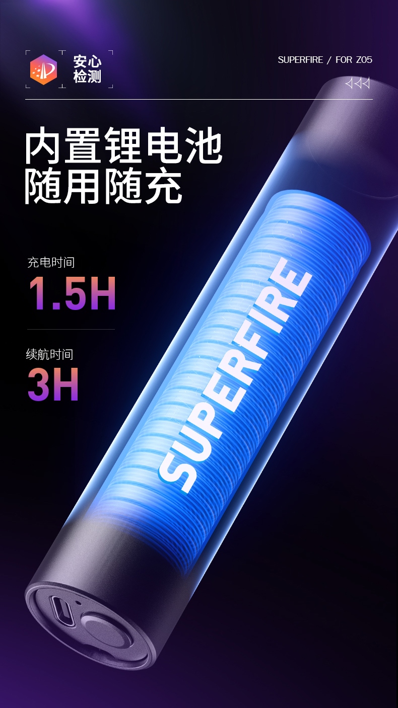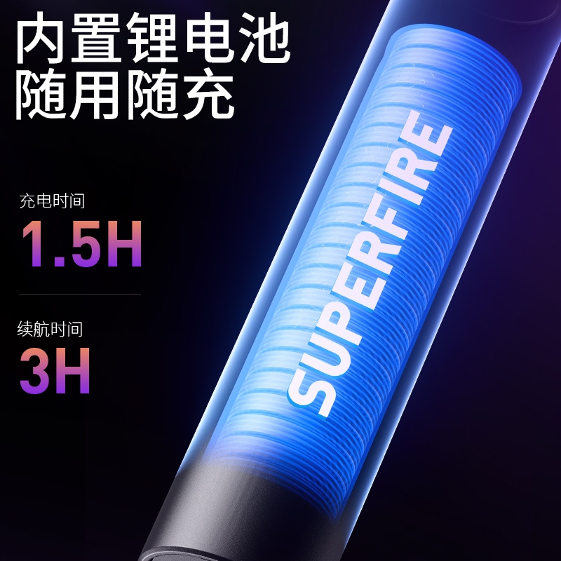 3、多样化充电,使用方便:设有Type-C充电接口,可使用充电器、充电宝、电脑等设备为手电充电。