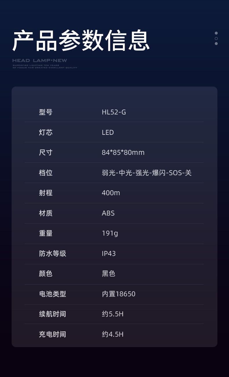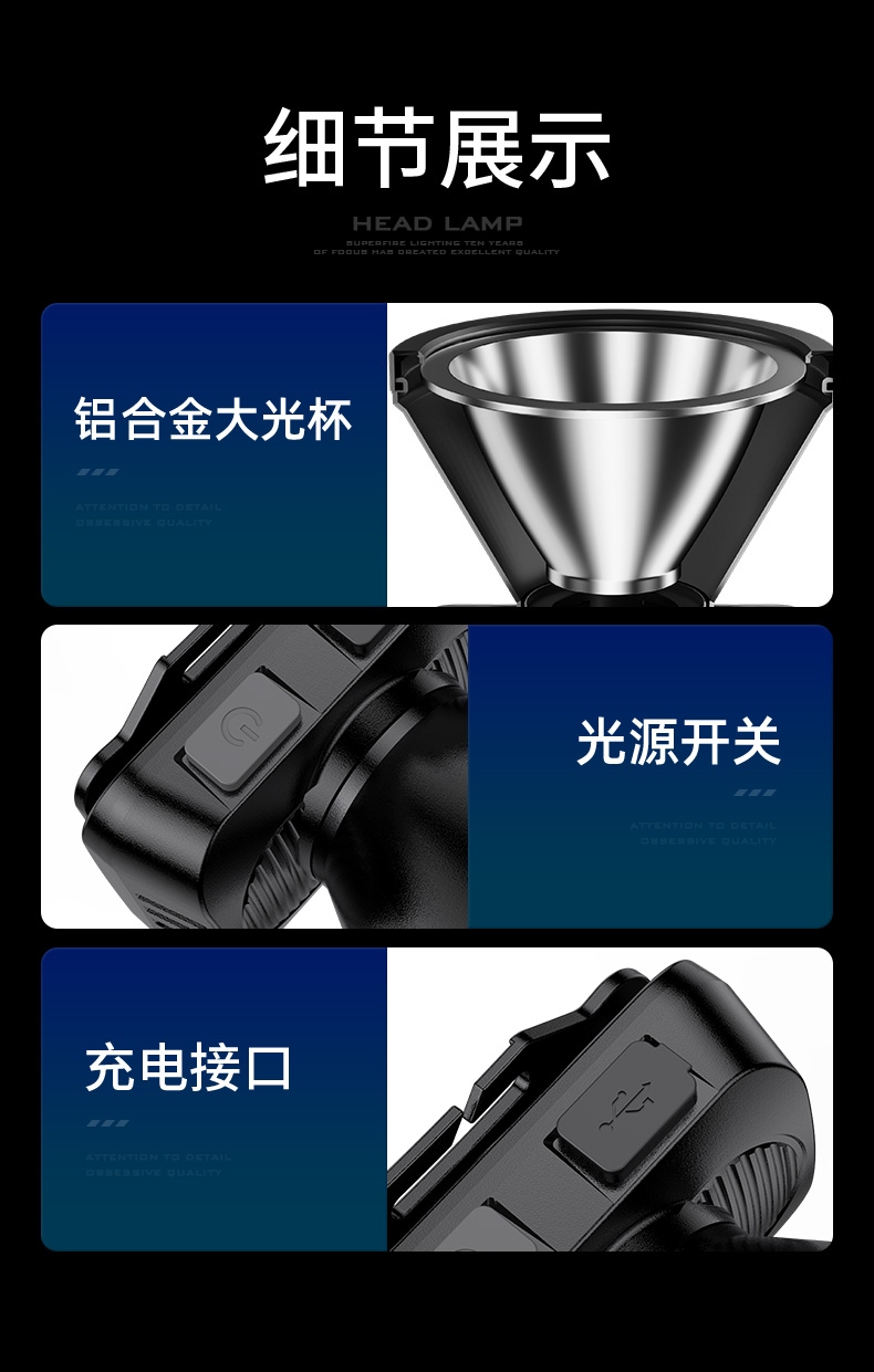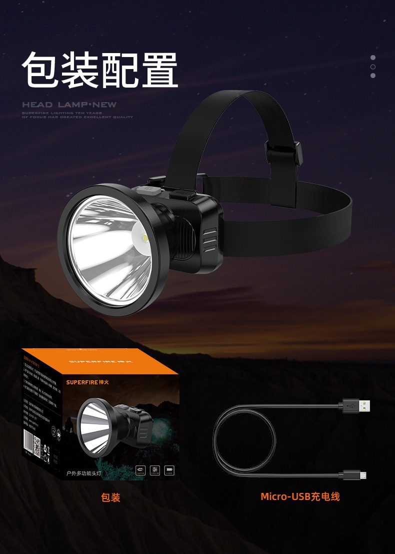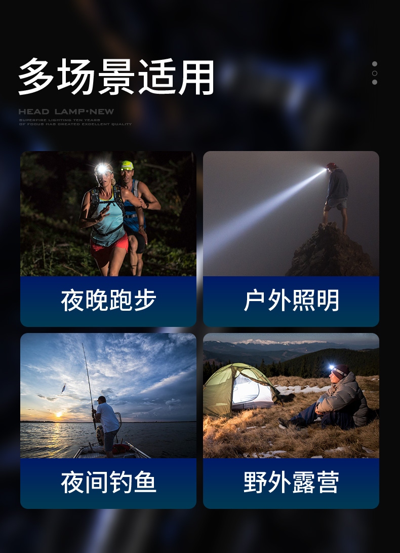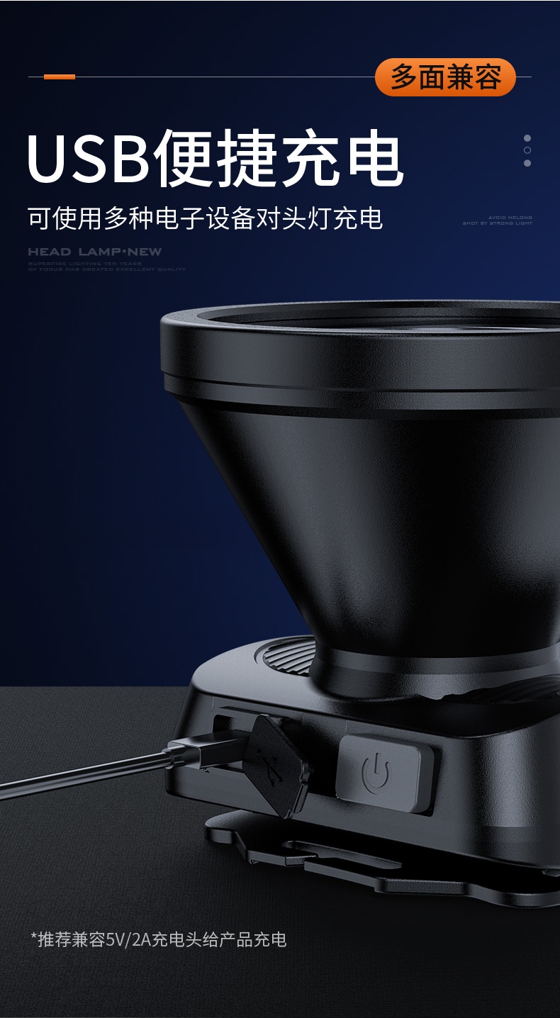 强光亮度,运动头灯,前后均衡设计,轻便不压头,可调节式头灯带,佩戴方便舒适,伸缩调焦,光照范围大,照射距离远,头灯角度调节,超90度角度随意调节,适宜各种环境使用