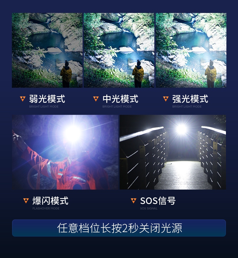 1、弱光、中光、强光、爆闪、SOS五挡使用模式,自由切换,可满足不同场景下的使用需求。