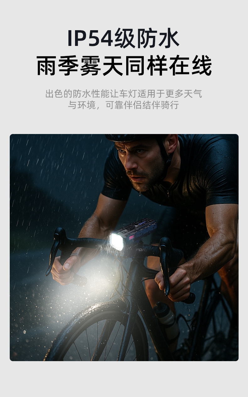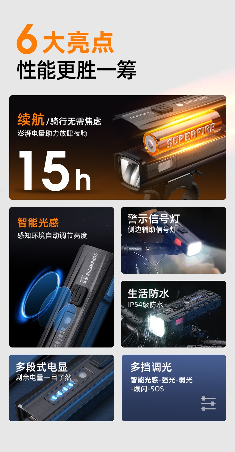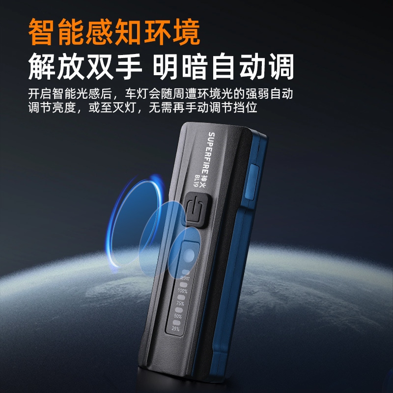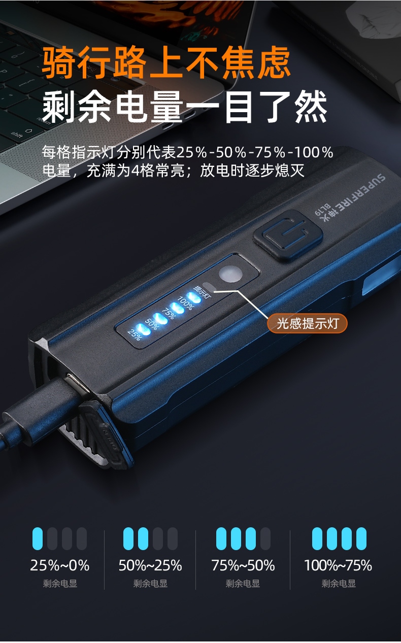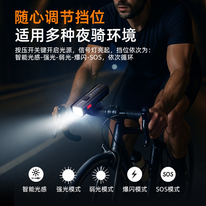 1,按压开关键开启光源,信号灯亮起,档位依次为:智能光感-强光-弱光-爆闪-SOS,依次循环,任意档位长按关灯。信号灯为辅助灯光,任意档位都会长亮。 2、智能光感:灯具会随着环境光的强弱自动调节车灯的亮度及灭灯。