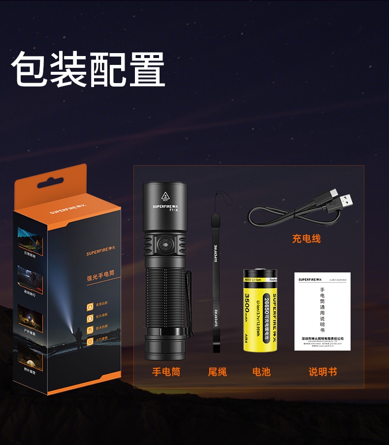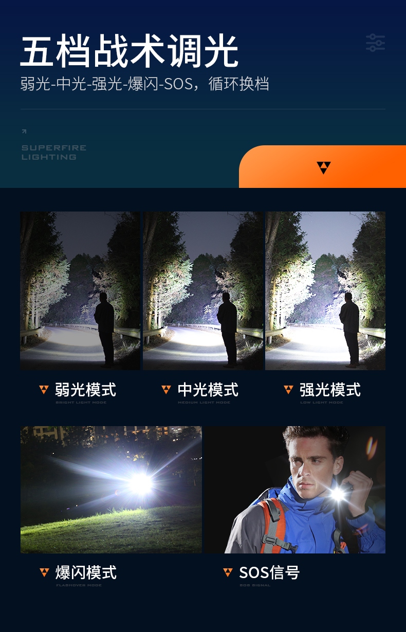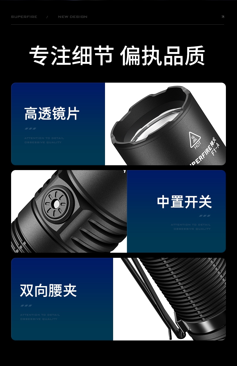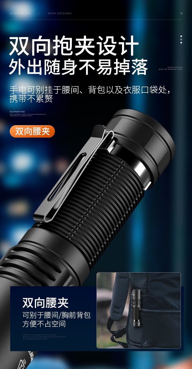 1、多档调光,可满足不同使用场景下的照明需求。 2、多种安全程序,可有效保护手电使用安全,延长手电使用寿命。 3、定焦手电,单手操控,简单方便。