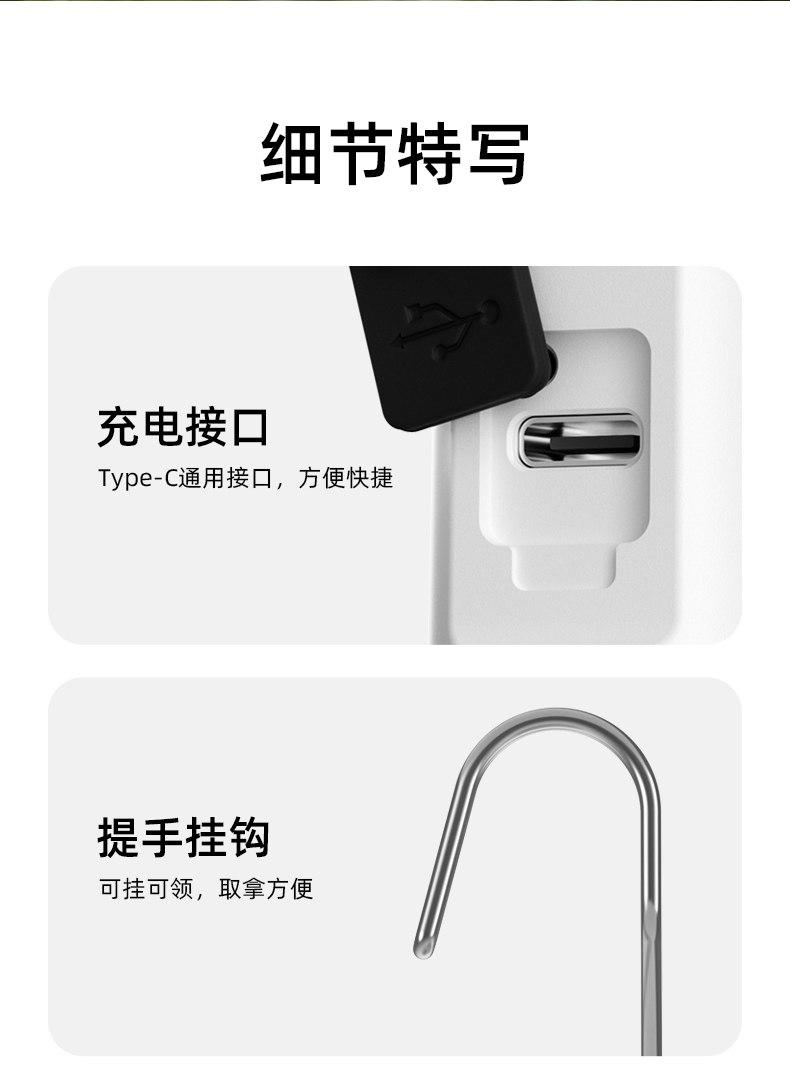 1.单击左边开关开启感应功能,同时开启强光档,续按关闭感应功能(关闭感应功能,光源不会关闭),当感应功能开启时,单击右边开关可正常调节档位。 2.多样化充电,使用方便:设有Type-c充电口,可使用充电器、充电宝、电脑等设备为灯具充电。 3.电量显示:实时