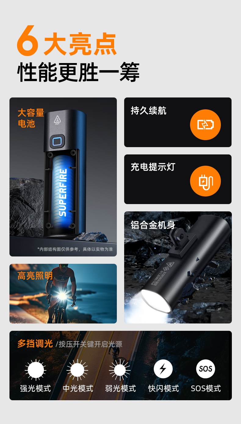2、多个档位随心切换,不同环境自在应对,按压开关键开启光源,长按关闭;