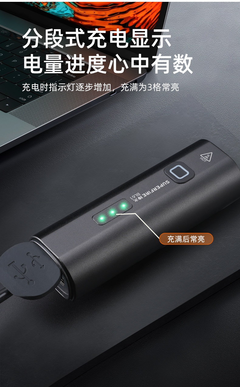 4、分段式充电显示,电量进度心中有数,充电时指示灯逐步增加,充满为3格常亮;