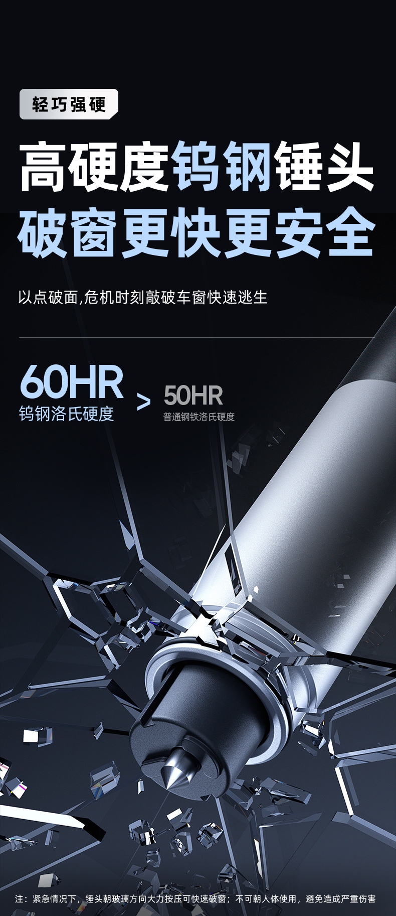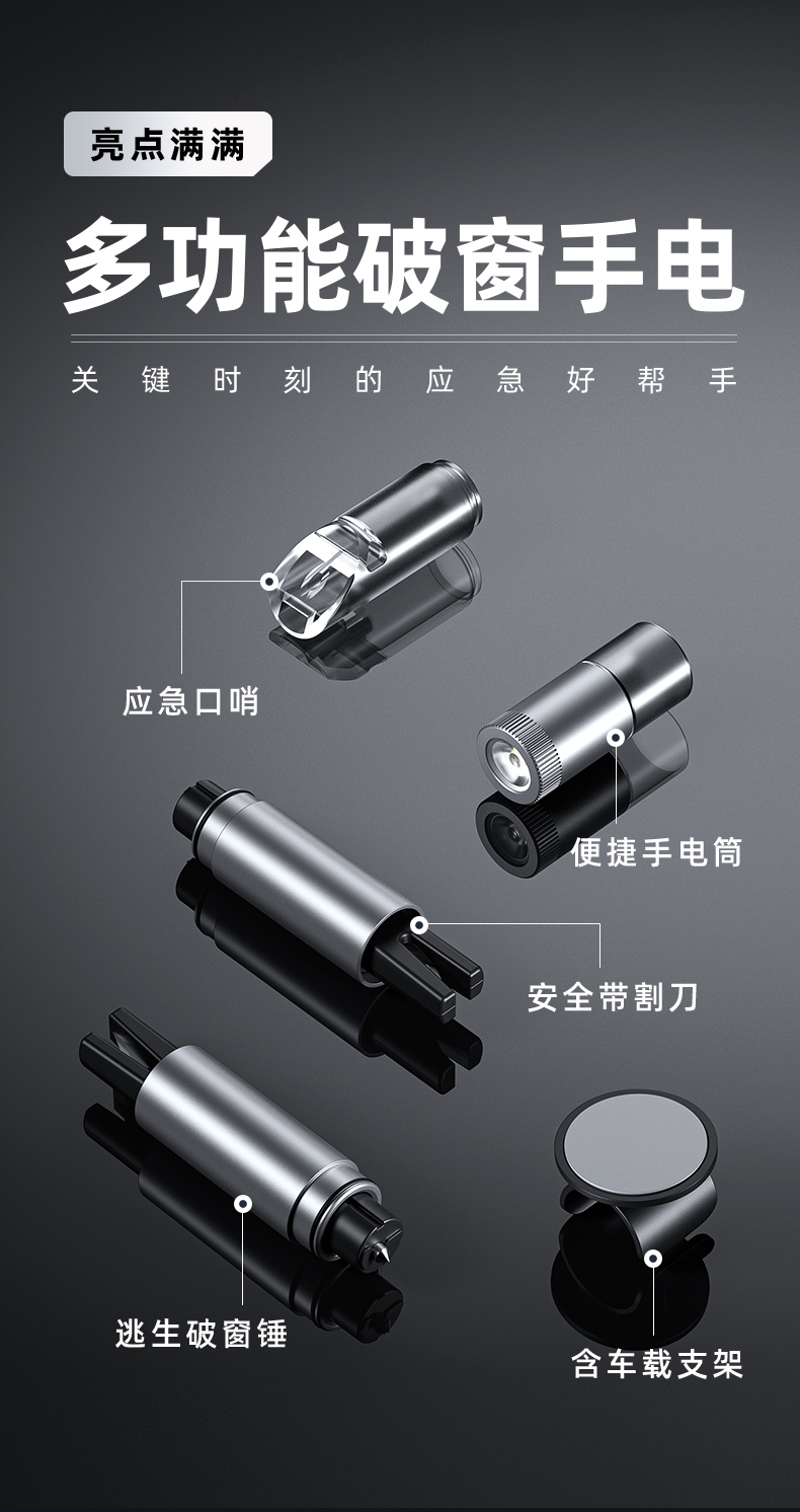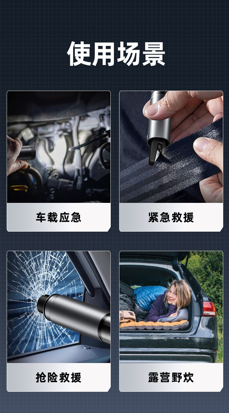 1、高硬度破窗锤,紧急情况下,破窗自救,车内应急必备。