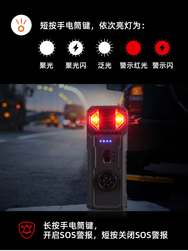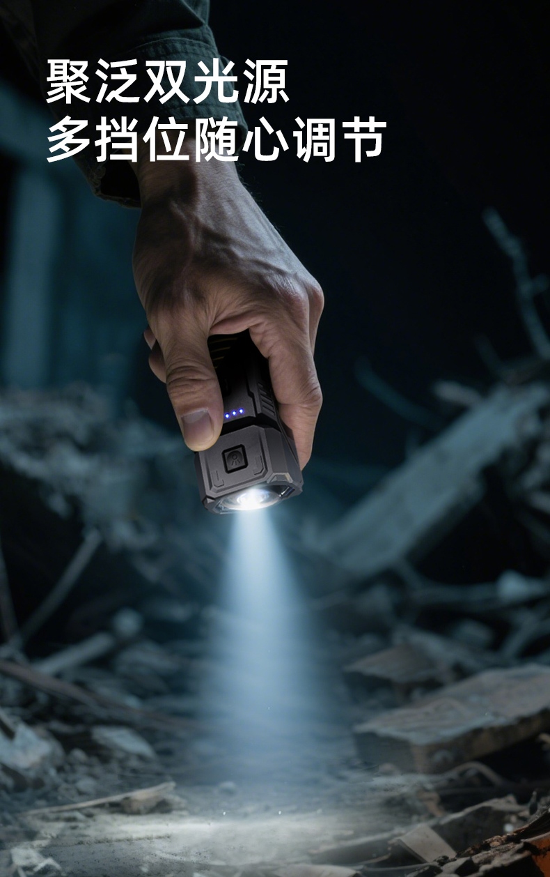 短按开关键,依次亮灯为:聚光→聚光闪→ 泛光→ 警示红光→警示闪→关闭。