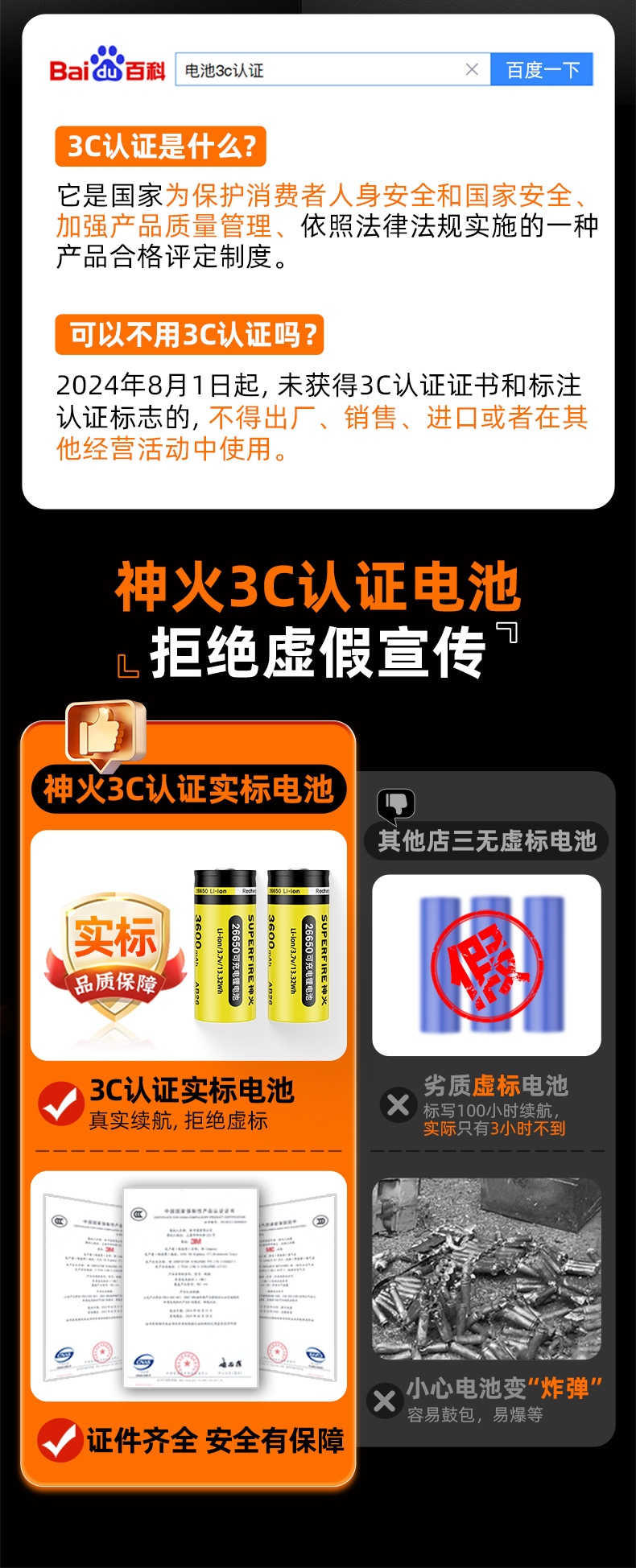 1、3C认证实标电池,真实续航,拒绝虚标,证件齐全安全有保障、澎湃性能、标准电压动力强劲; 2、防爆外壳,高强度不锈钢设计,有效降低电池因碰撞,冲击而短路的风险; 3、持久耐用,可循环使用500+次,节能环保,经济耐用;