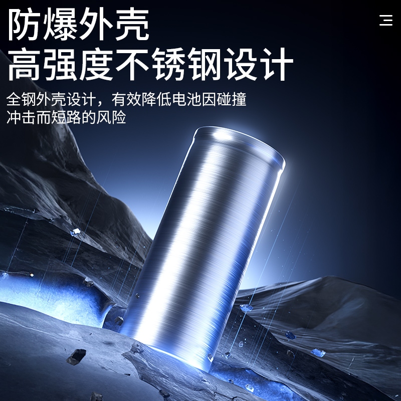 2、防爆外壳,高强度不锈钢设计,有效降低电池因碰撞,冲击而短路的风险;