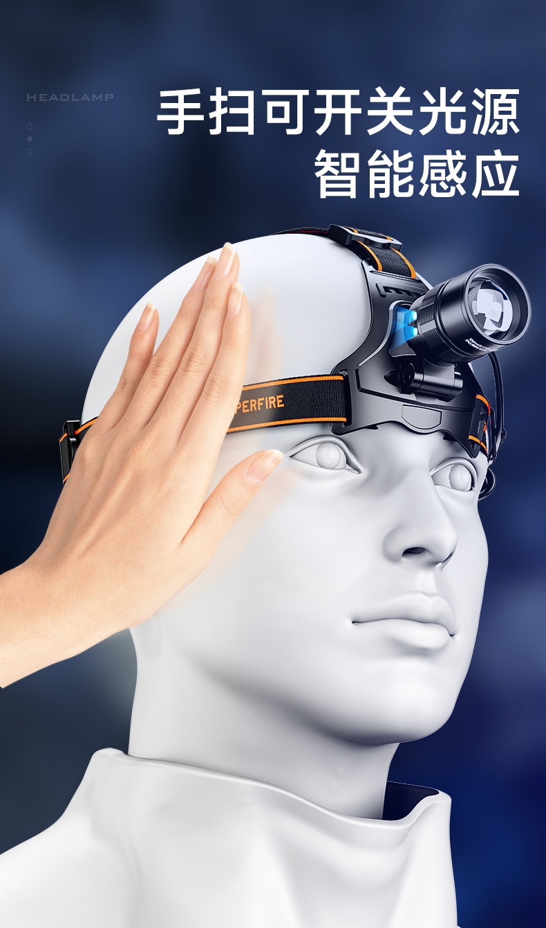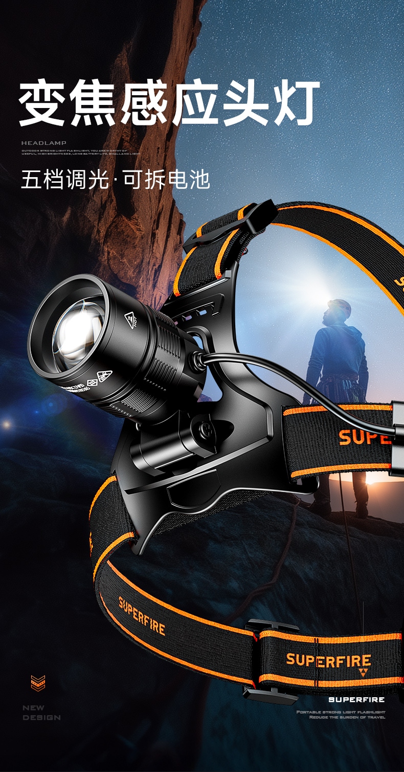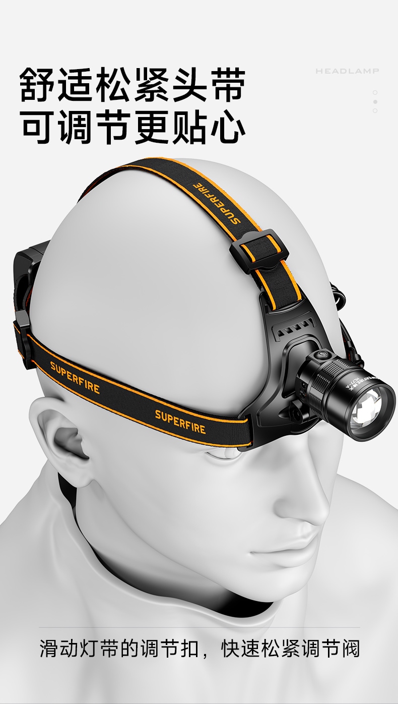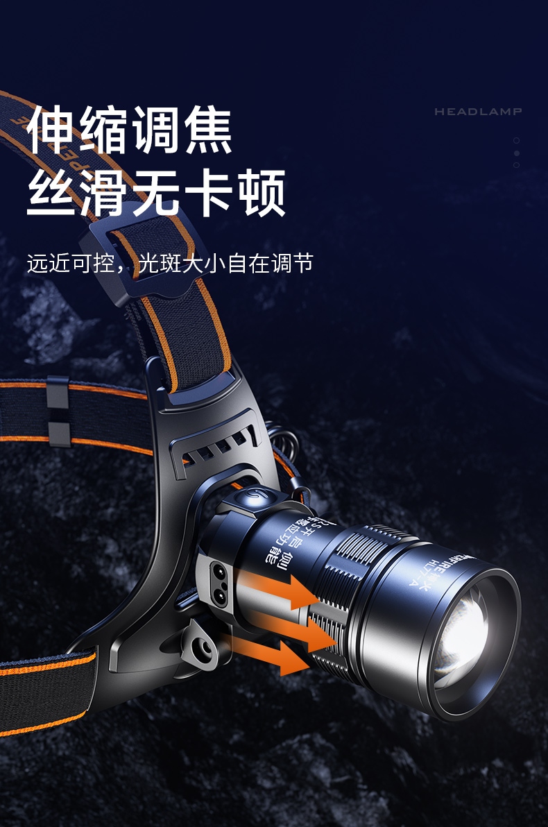 强光亮度,运动头灯,前后均衡设计,轻便不压头,可调节式头灯带,佩戴方便舒适,伸缩调焦,光照范围大,照射距离远,头灯角度调节,超90度角度随意调节,适宜各种环境使用