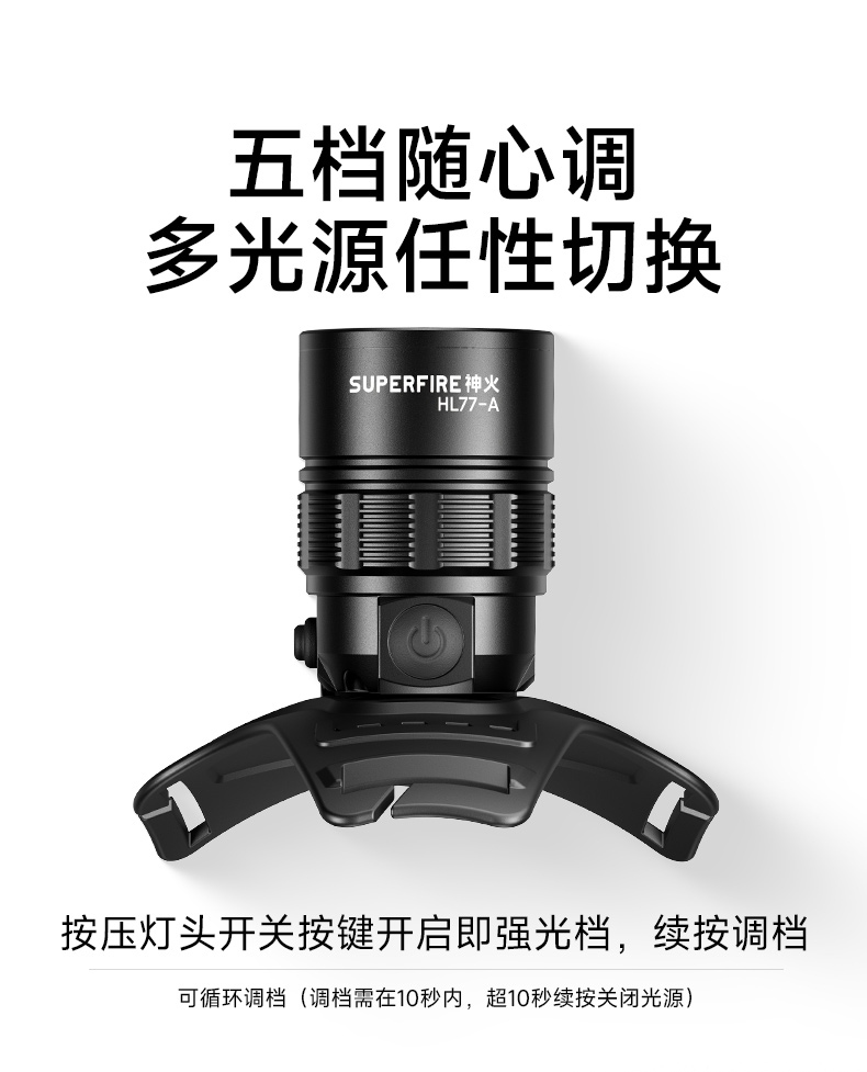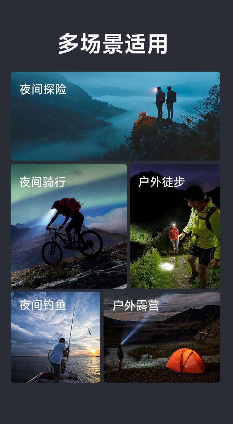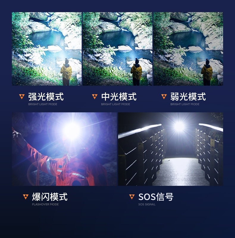 1.五档一体:强中弱、爆闪、SOS自由切换,可满足不同场景下的使用需求。