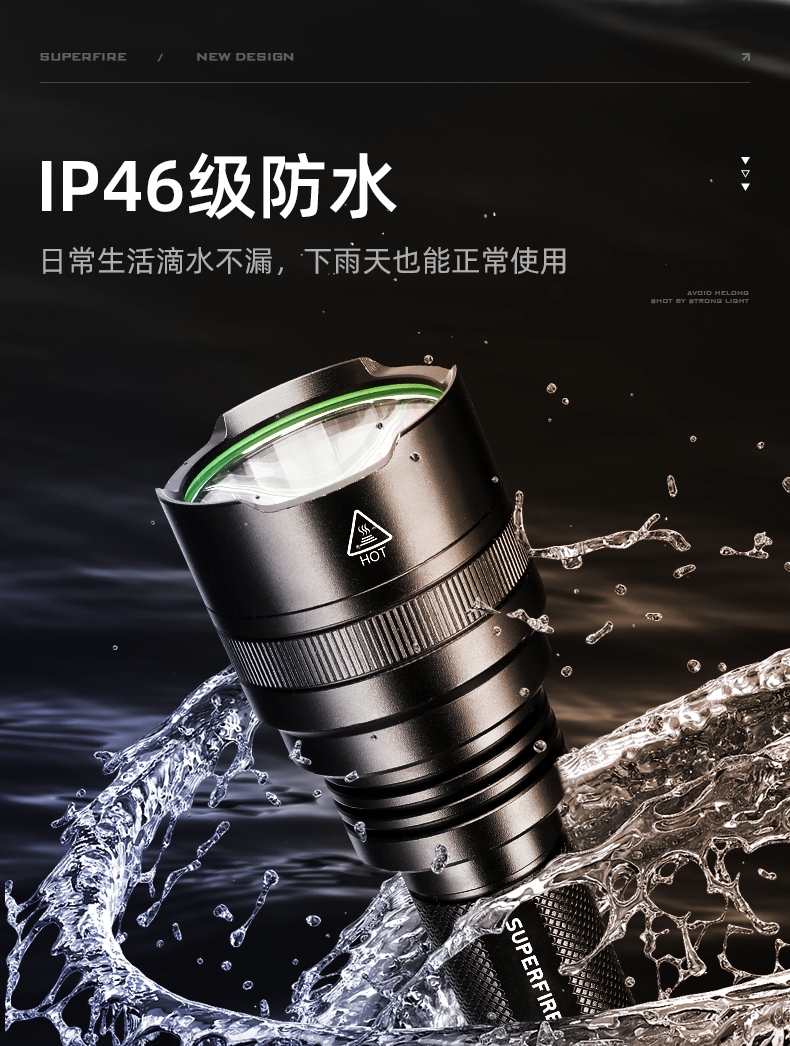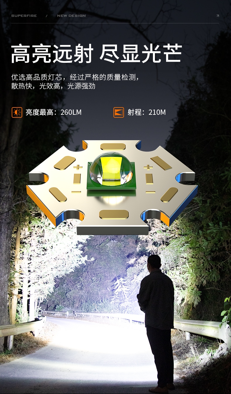 1、千米远射,射程更远,光斑更聚焦。 2、进口灯珠,亮度高,照明效果更好。 3、前后双按键,光源一键点亮,高亮瞬间开启。