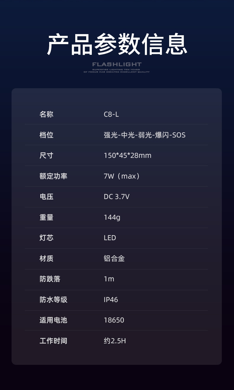四档调光 Type-C充电 电量显示 铝合金筒身 持久续航 强力防水