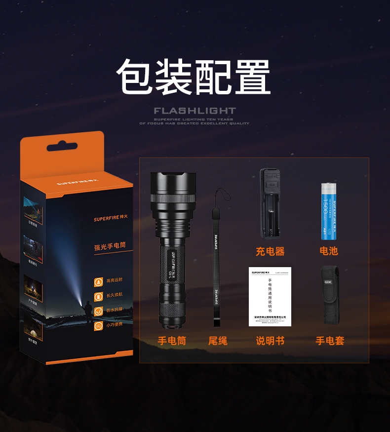 1、强光-中光-弱光-爆闪-SOS五档调光,可满足不同场景需要。 2、铝合金外壳,防水耐摔。 3、经典外观,小巧便携。
