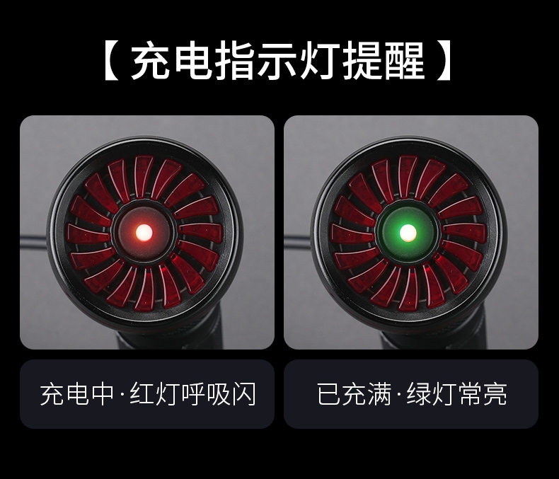 4、充电时充电指示灯为红色呼吸灯,充满为绿色长亮.