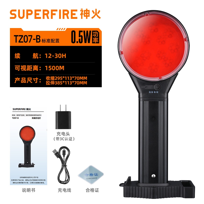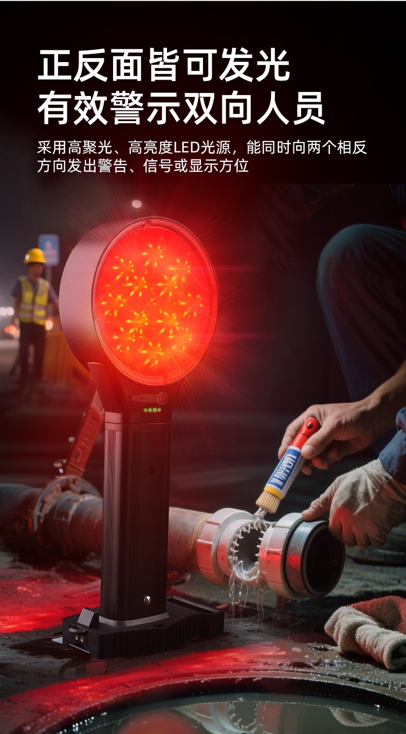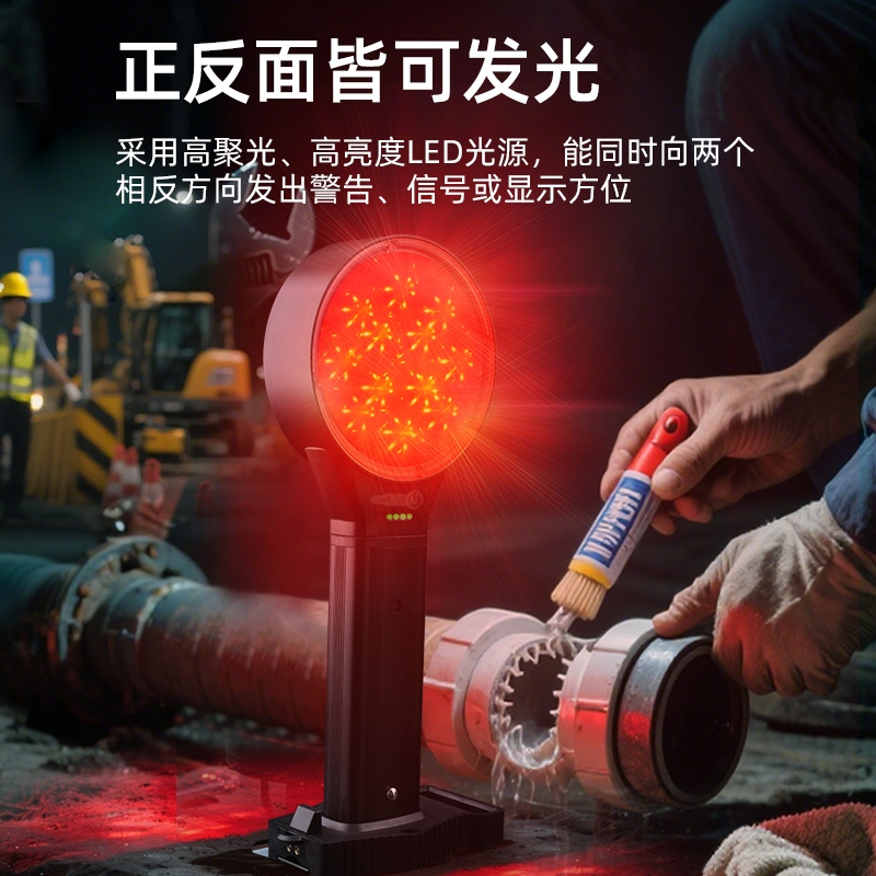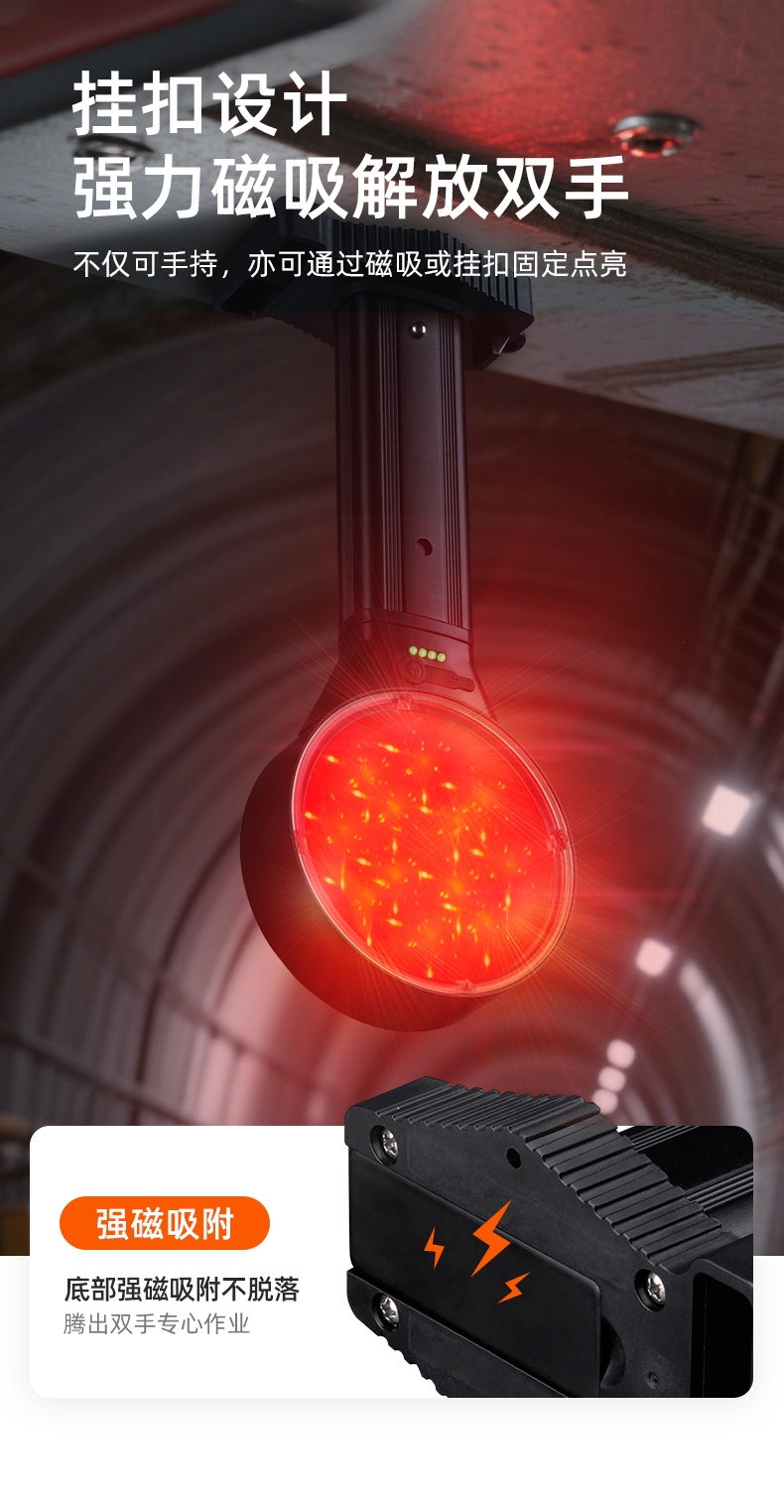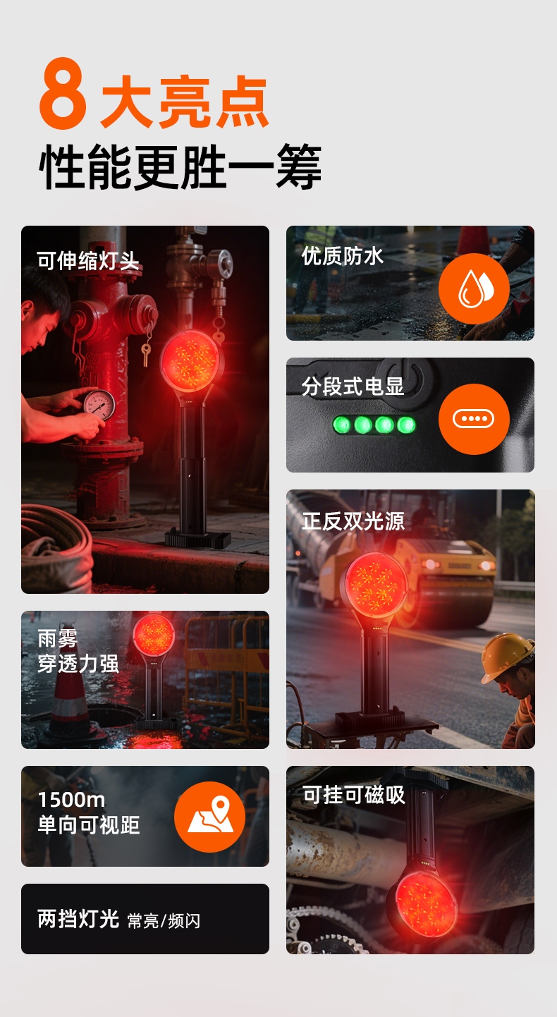 正反两面发光,单向可视距离达1500米,灯头可伸缩9CM,雨雾穿透力强,两挡灯光,钢化玻璃镜片,可磁吸安装,可挂装